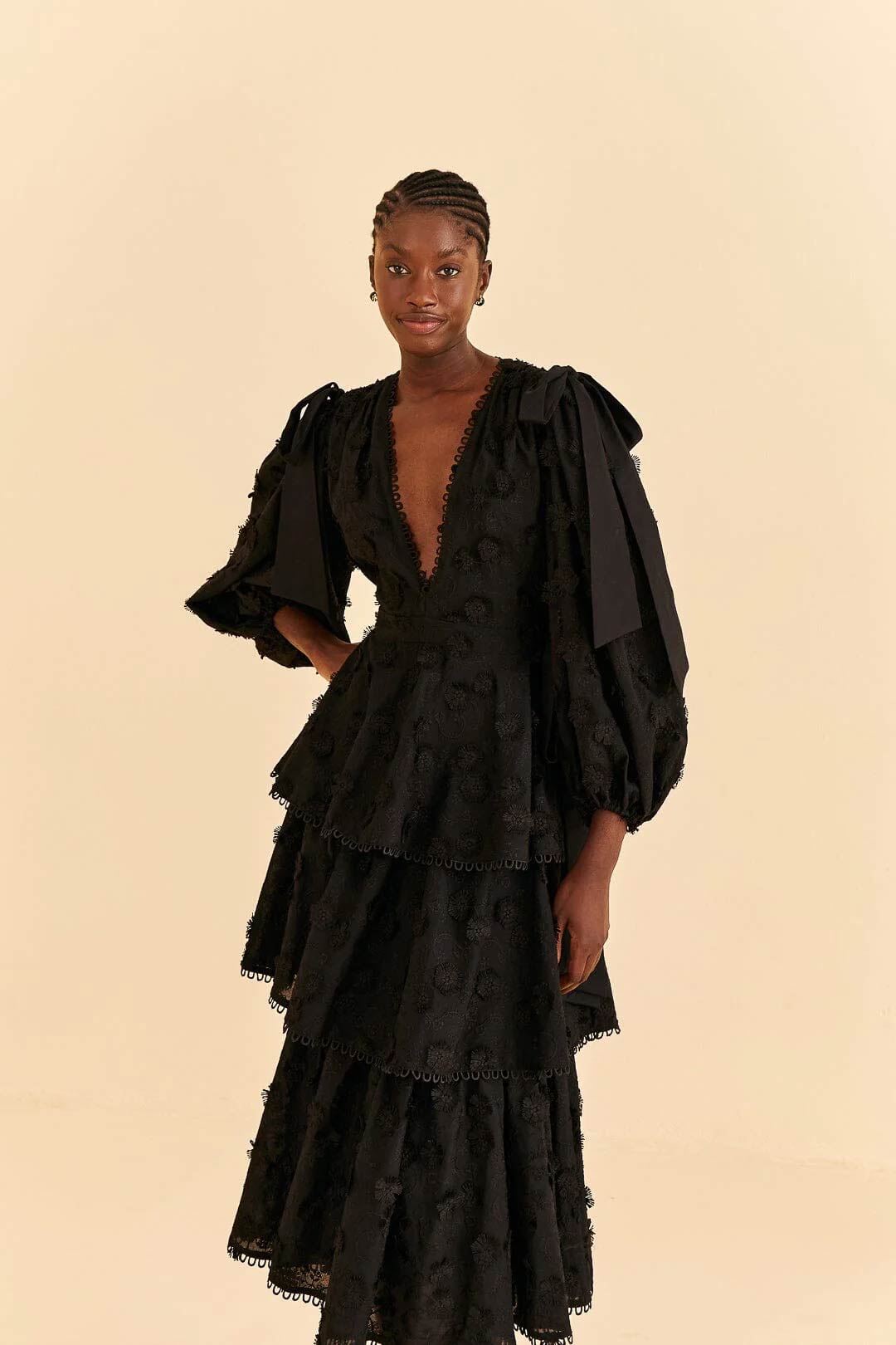 FARM TIO BLACK FLOWERS TIERED MIDI DRESS