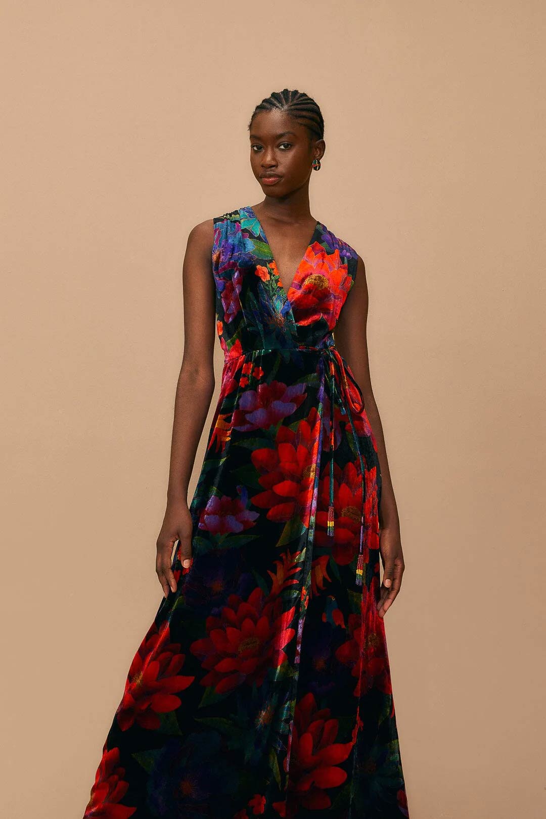 FARM RIO BLACK FLOWER SEASON MAXI WRAP DRESS