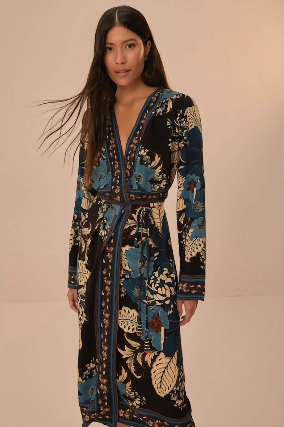 FARM RIO BLOSSOM TAPESTRY L/S WRAP DRESS – BLACK