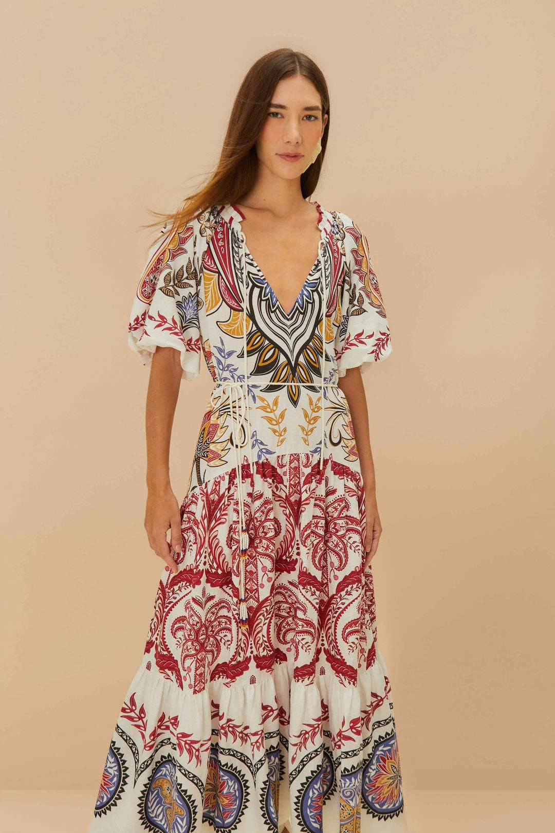 FARM RIO RED NATURE BEAUTY LONG SLEEVE MAXI DRESS