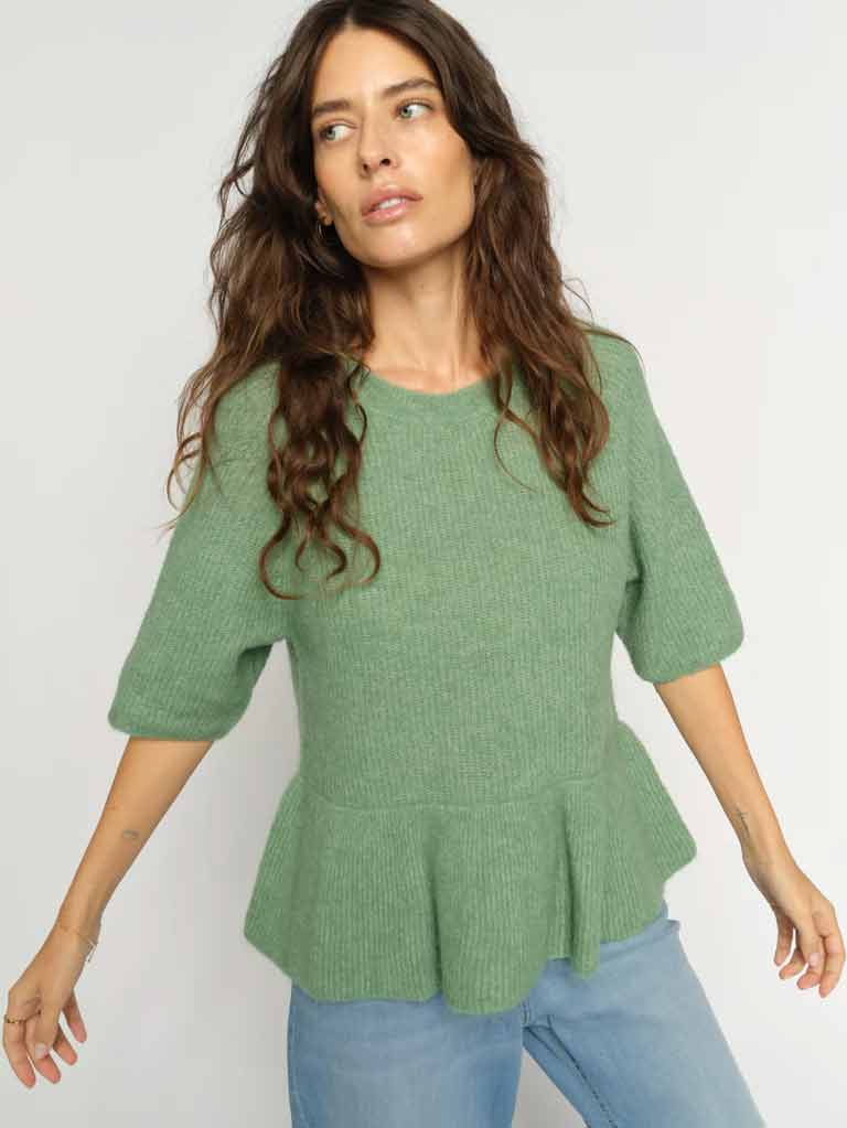 • MOS MOSH O-NECK FRILL SHORT SLEEVE KNIT TURF GREEN