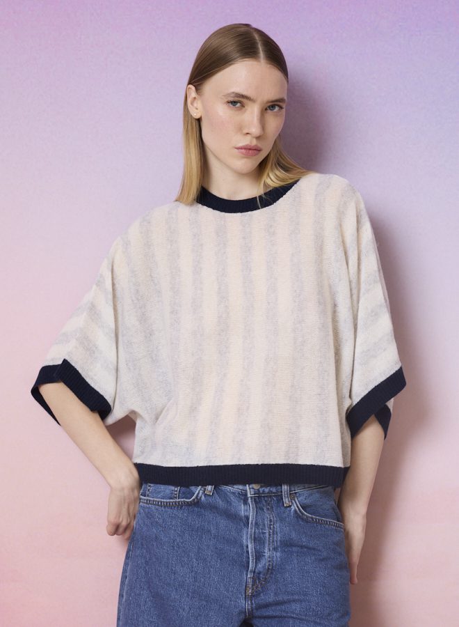 A fine, lightweight, and airy knit, designed for summer. Its delicate nature requires special care. To preserve its beauty, we recommend folding the garment rather than hanging it, as hangers could damage its structure. Handle it with care so it remains a wardrobe staple, season after season.