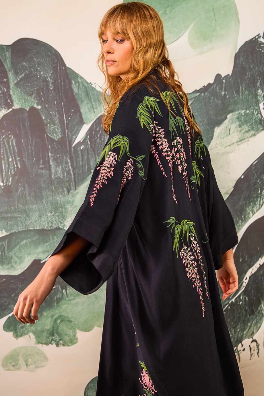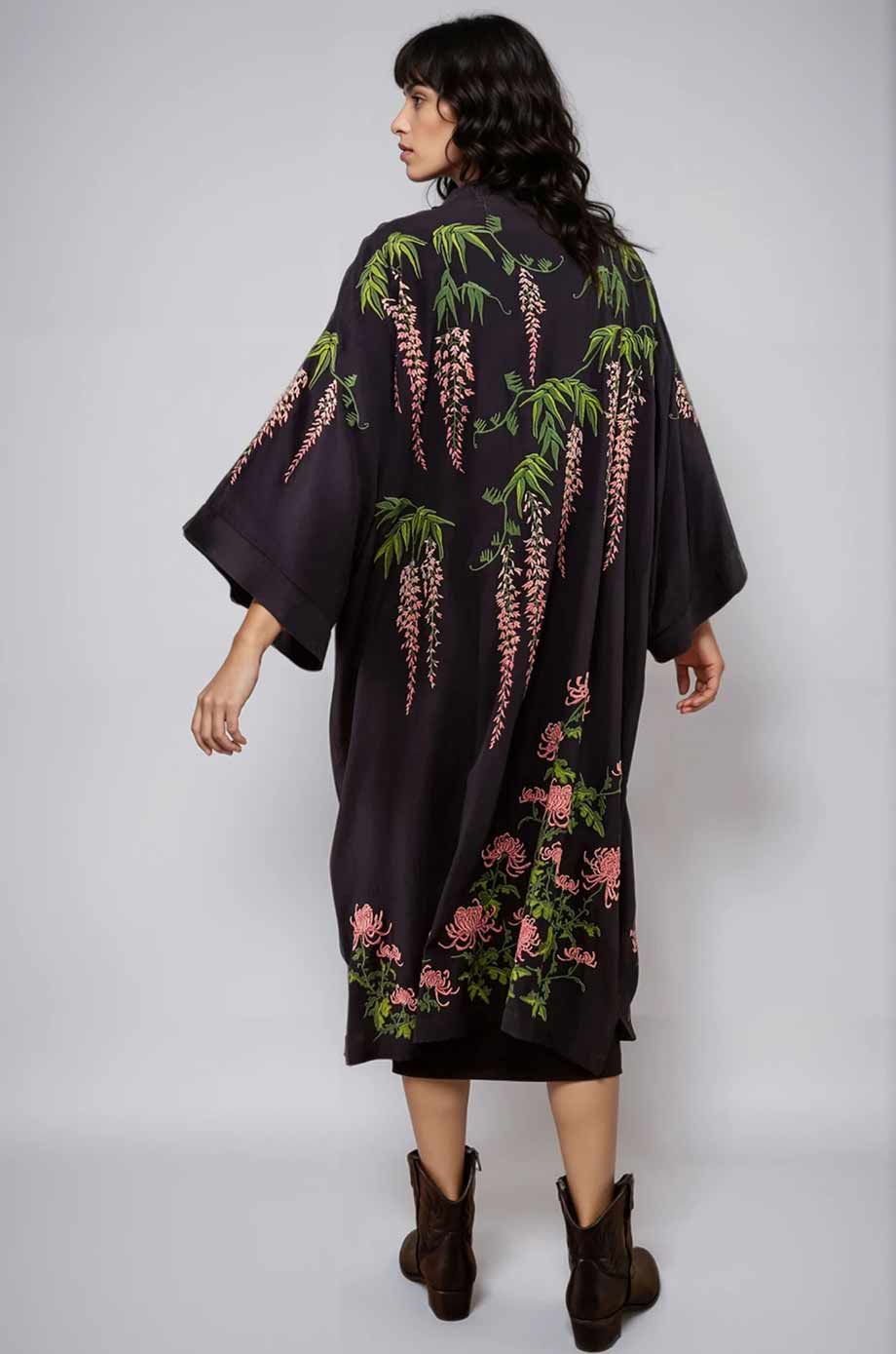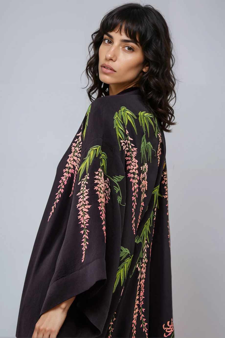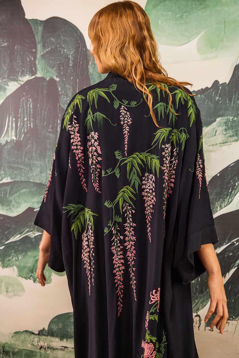 This stunning black fully lined long embroidered kimono is an elegant piece. Inspired by Japanese kimonos it features wisteria and chrysanthemums in a blend of contrasting and detailed pink & green embroidery.