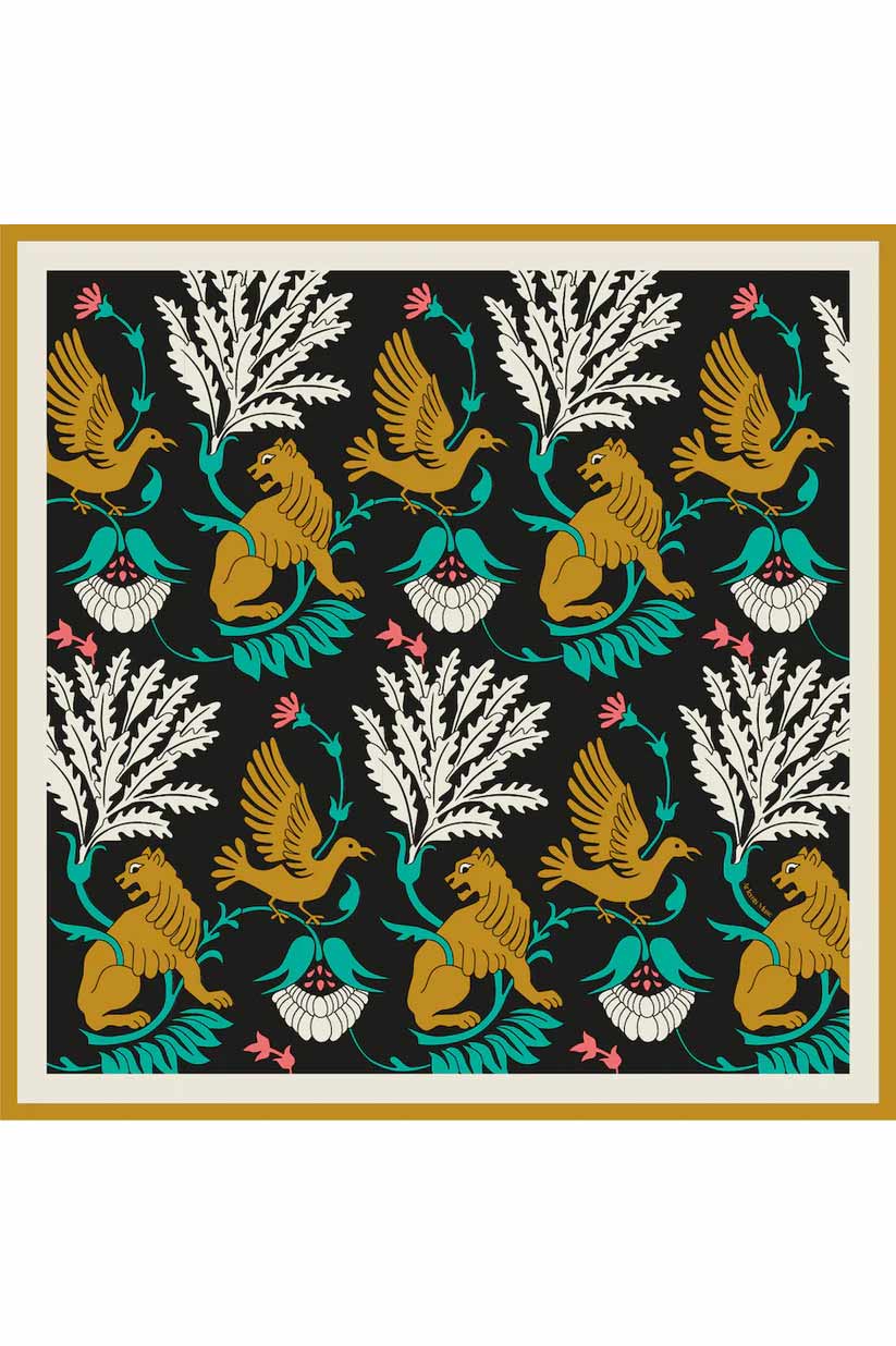 A bold homage to myth and majesty, the Regal Doves & Lions scarf celebrates strength and serenity in perfect harmony. Inspired by ancient motifs and reimagined for the modern aesthete, this statement piece features golden lions and soaring doves entwined among stylised florals in vivid teal, coral and ivory. Set against an inky black ground and framed with a warm ochre border, the design evokes the power and poise of a timeless tapestry.