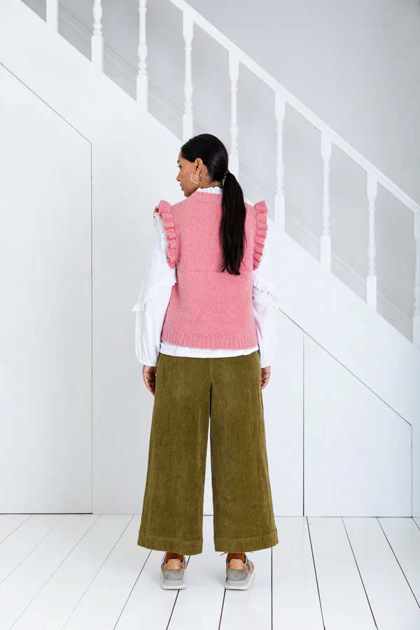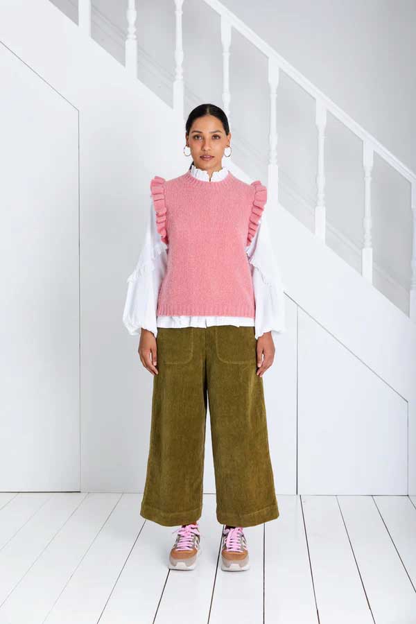 A knitted vest in a soft + lofty yarn, with ribbed detailing at the collar and hems complemented by feminine ruffles on the armholes. This layering piece effortlessly complements both tailored pants and relaxed jeans.