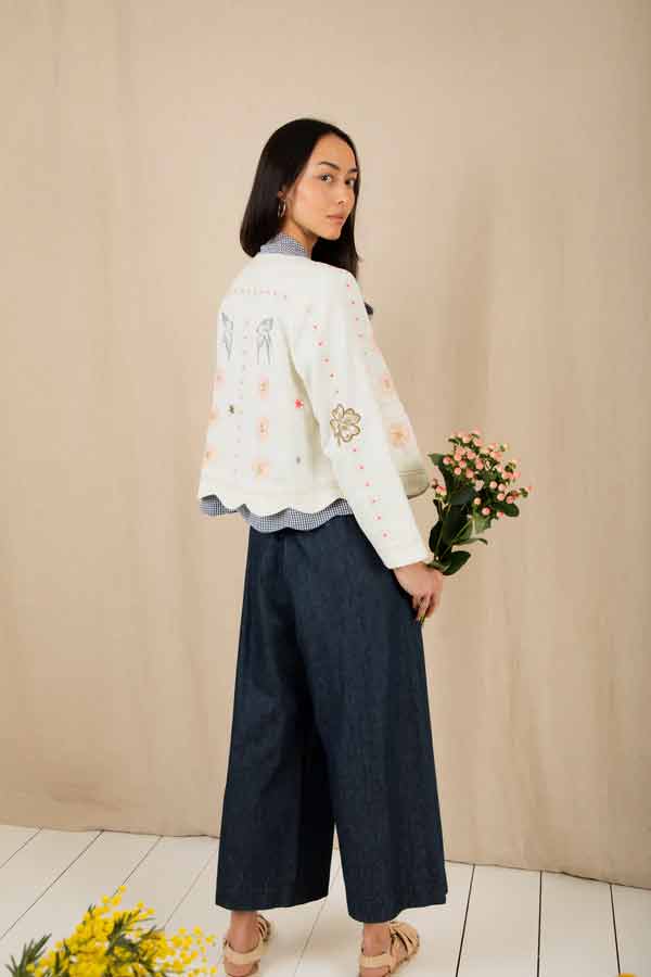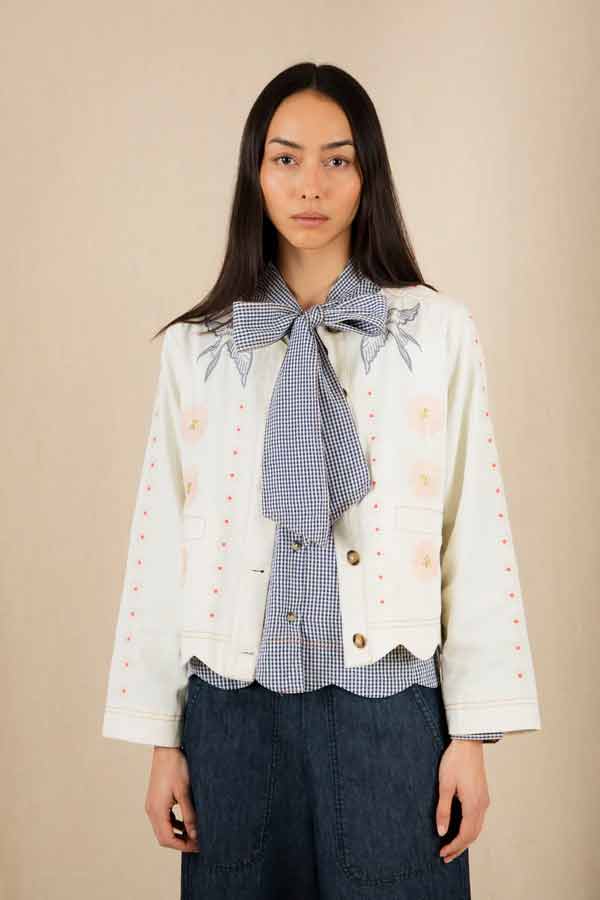 This is a beautiful + unique jacket, with a detailed placement embroidery, cut in a modern, boxy + relaxed shape, made in soft cotton twill, with contrast tan twin-needle detail.