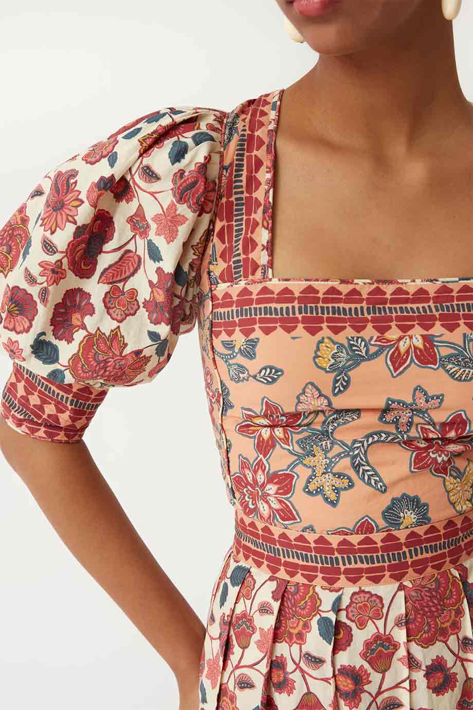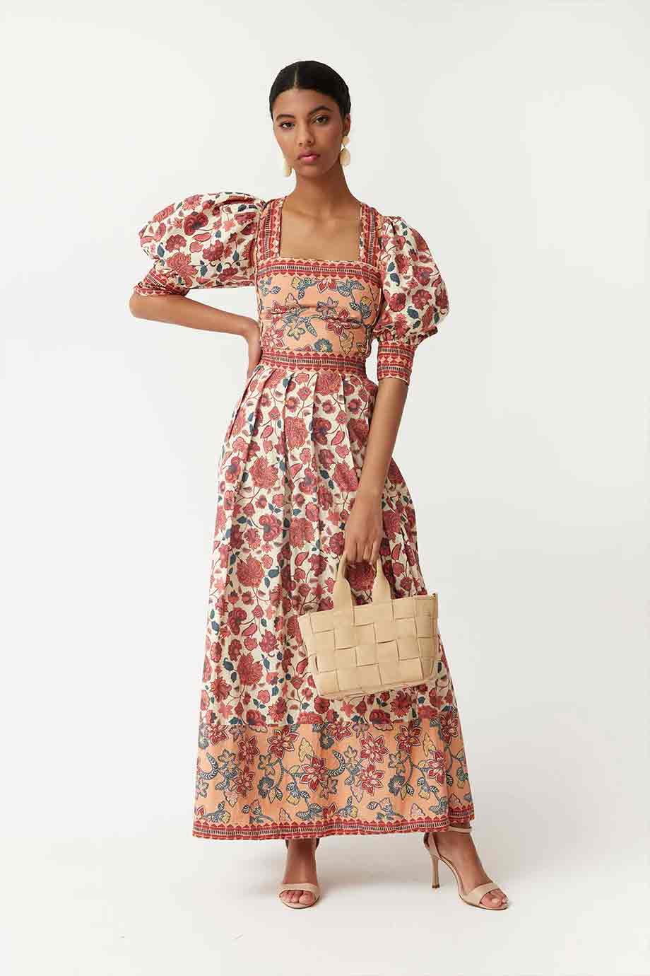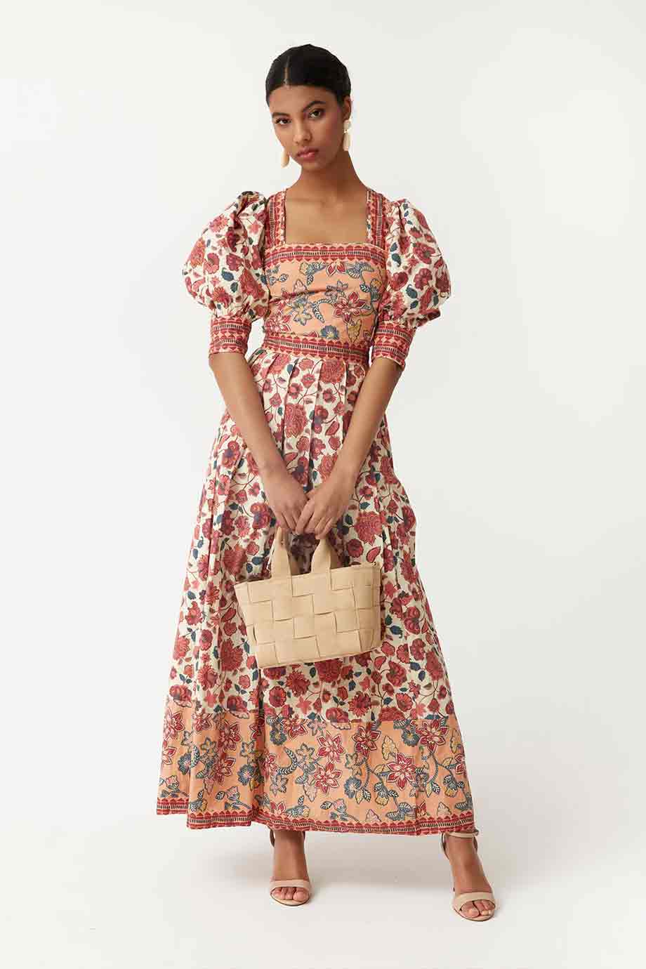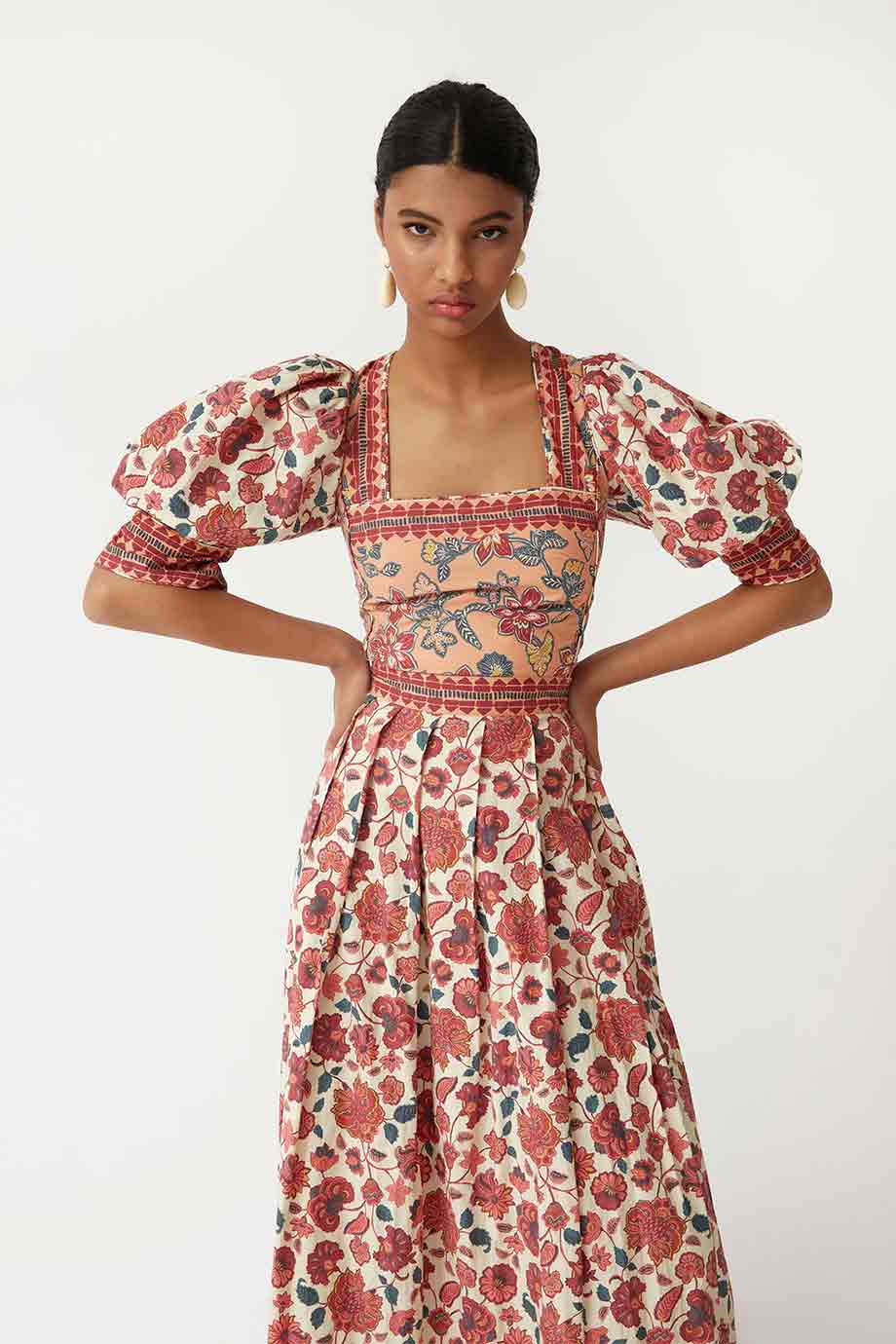 This two-piece set is a real hit this season. Comprised of a structured top with puff sleeves and a long, flowing skirt, it stands out with its beautiful multicolored floral print on a peach background, giving it a very flattering folk vibe.