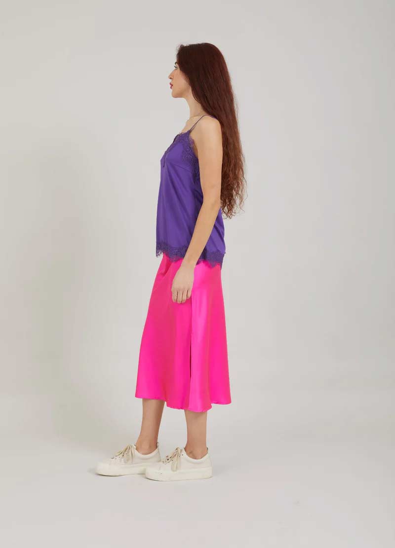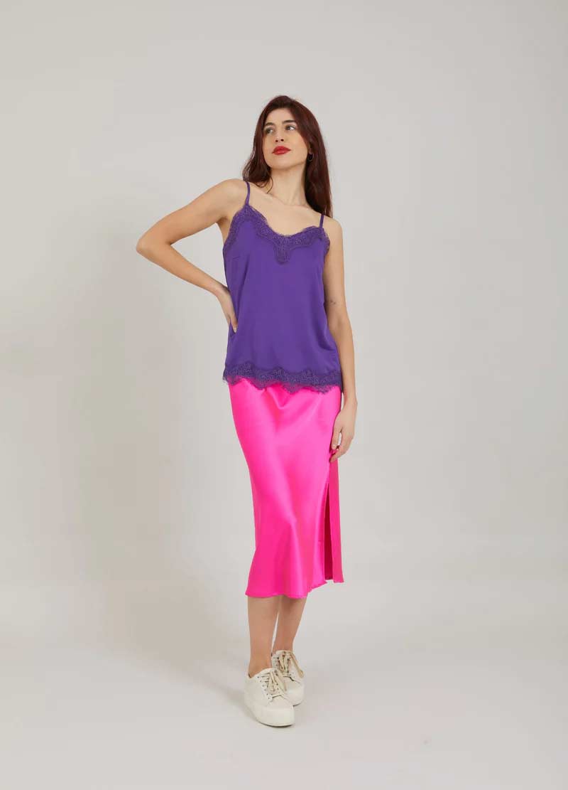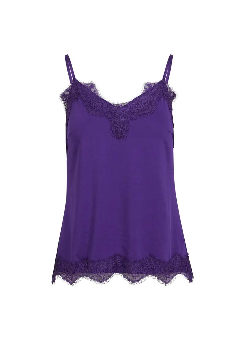 A sleek and elegant camisole with a soft V-neck and adjustable spaghetti straps. The top features lace details and has a relaxed fit. Can be worn under a sweater or a jacket, but also just as a top.