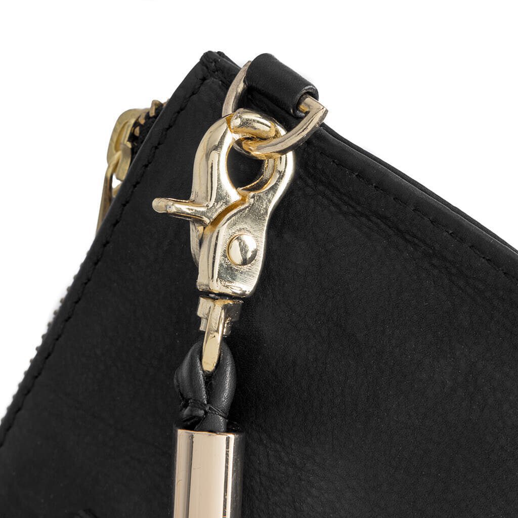 Purse in silky soft and delicious leather quality. The purse is decorated with a pocket at front and has a wrist strap with golden details.