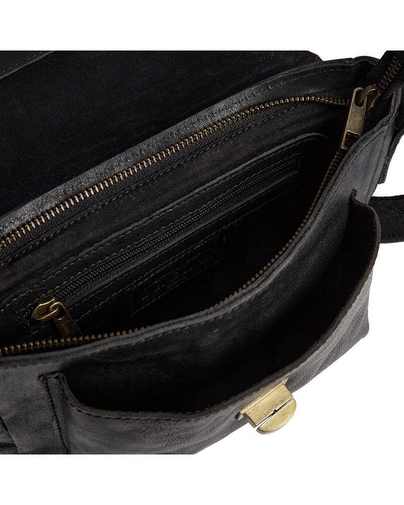 Measuring H: 15 x W: 23 x D: 7 cm, this crossover is compact yet spacious enough to hold your essential items. It features a flap closure with a small lock, providing an elegant and secure fastening. Inside, the bag is divided into a main compartment that zips closed for added security, along with a small pocket for storing smaller items.