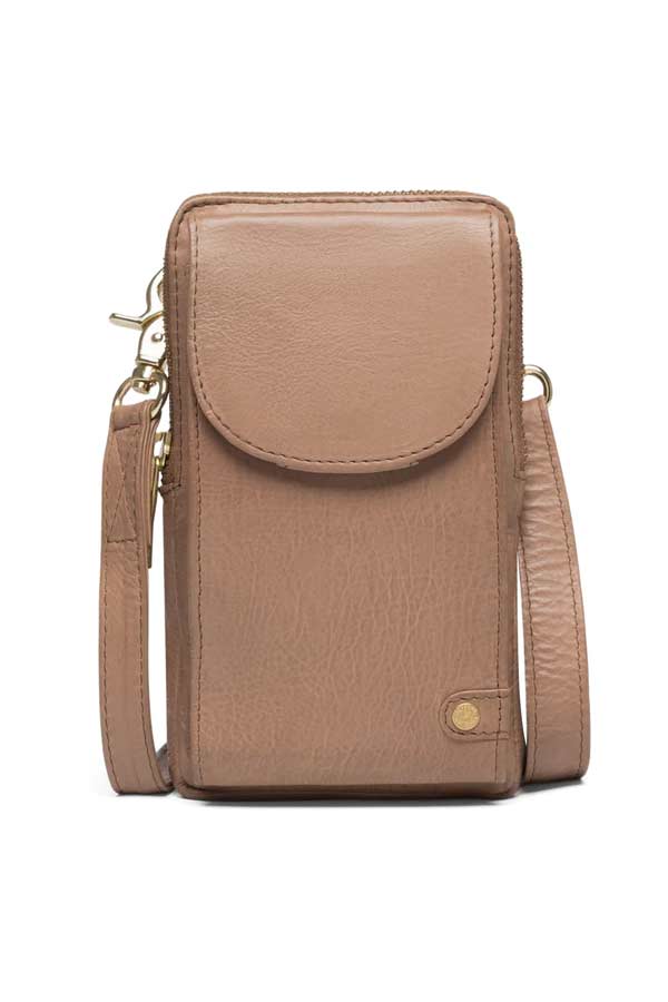 Mobilebag in delicious leather quality. The mobilebag is decorated with a pocket on the front which is closed with a push button as well as with gold colored details and zippers.