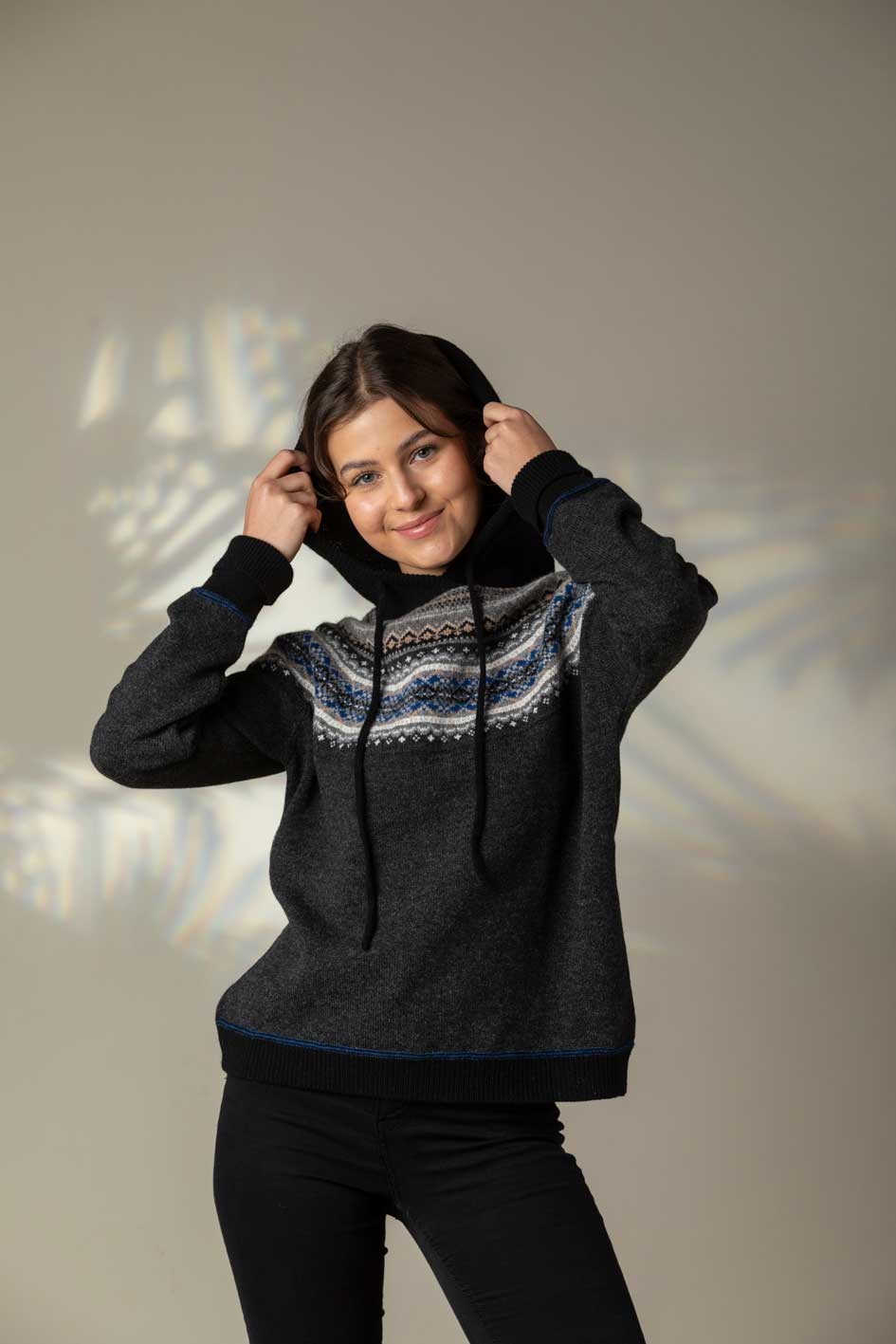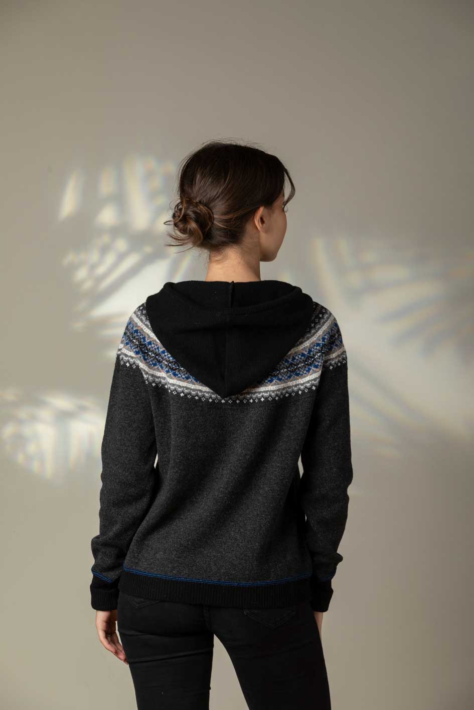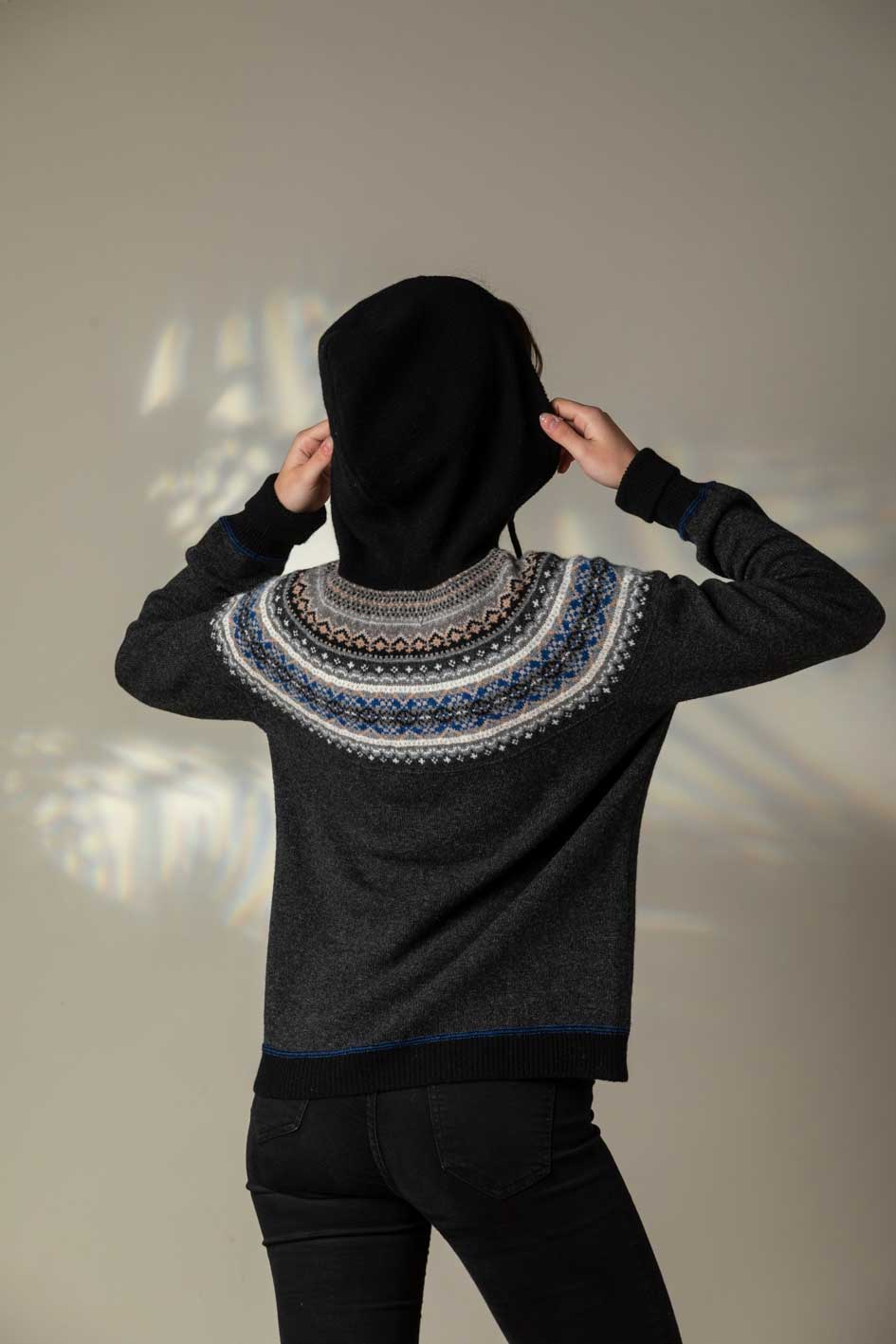 A sporty take on the classic Fairisle yoke, the Alpine features long rib cuffs for warmth and a generous hood with a matching knitted cord. Regular fit—size up for a looser look. Made from 100% soft Merino wool, spun in Yorkshire, and knitted in the EU.