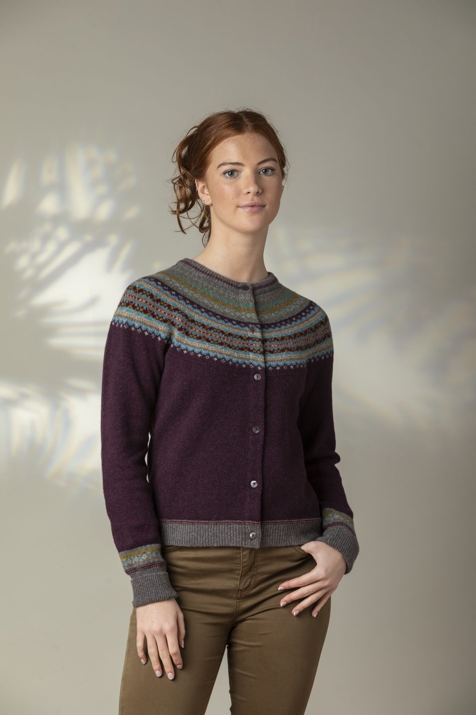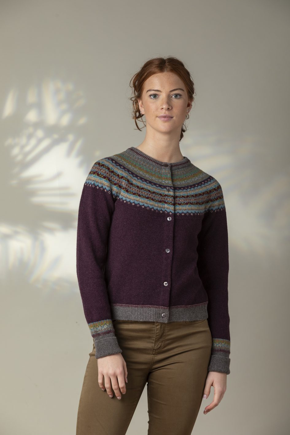 This design is a contemporary take on the Scottish fairisle yoke pattern with a small rib hem around the hip. Above the long rib cuffs is small pattern detailing mimicking a bracelet. Our colours take months to prepare and each year we offer new colourways. The cardigan is front opening and lined with grosgrain ribbon to hold the mother of pearl shell buttons. The cuffs are extra-long for extra warmth or to fit longer arms.