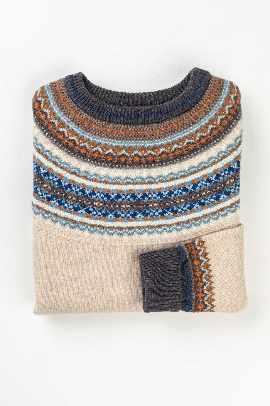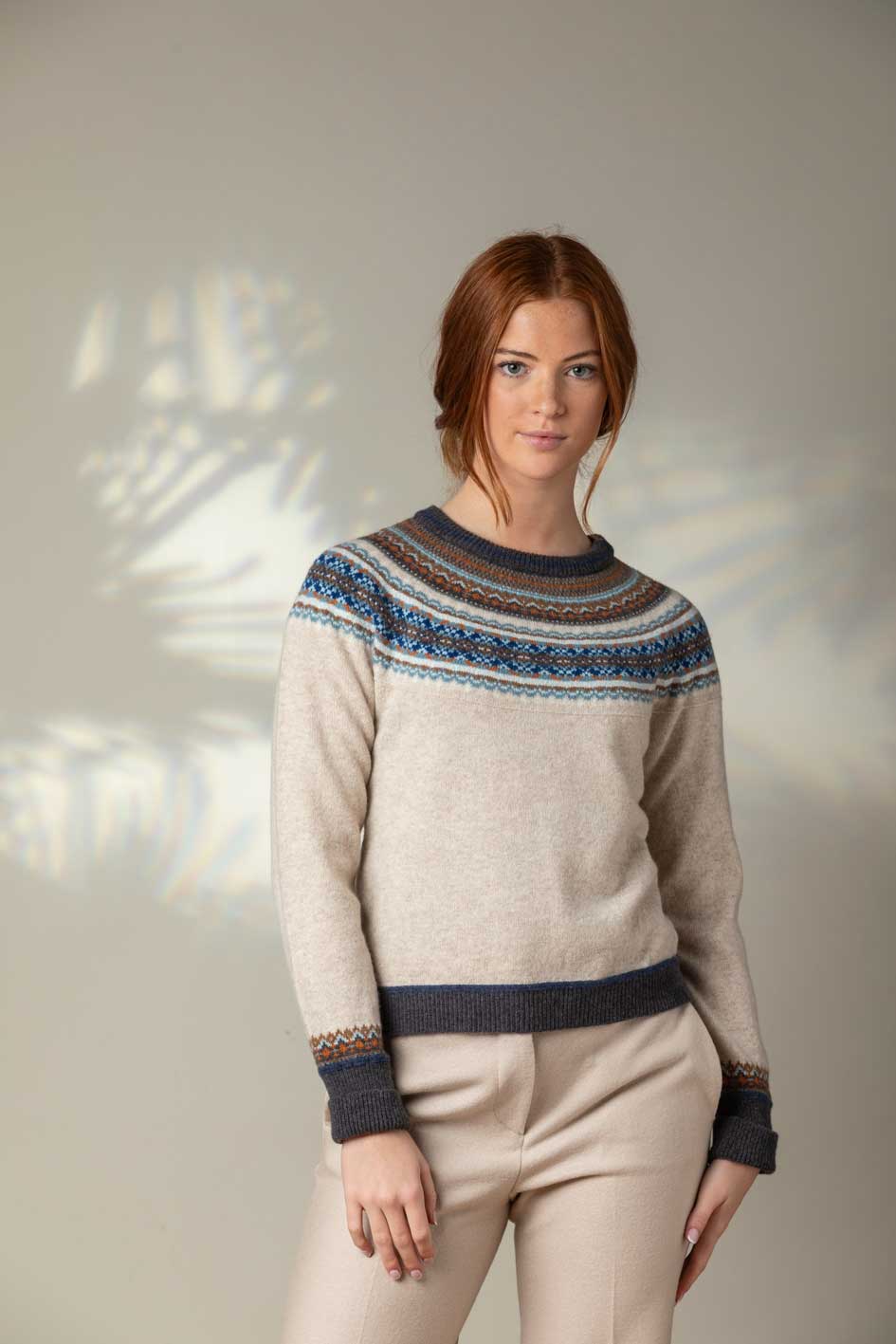 A modern interpretation of the Scottish Fairisle yoke pattern, this design features a subtle rib hem around the hip for a contemporary touch. Above the elongated rib cuffs, small pattern detailing mimics a bracelet, adding a unique flair.