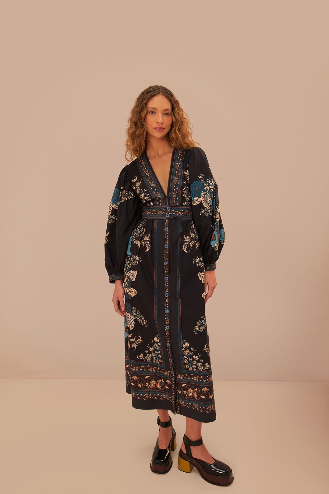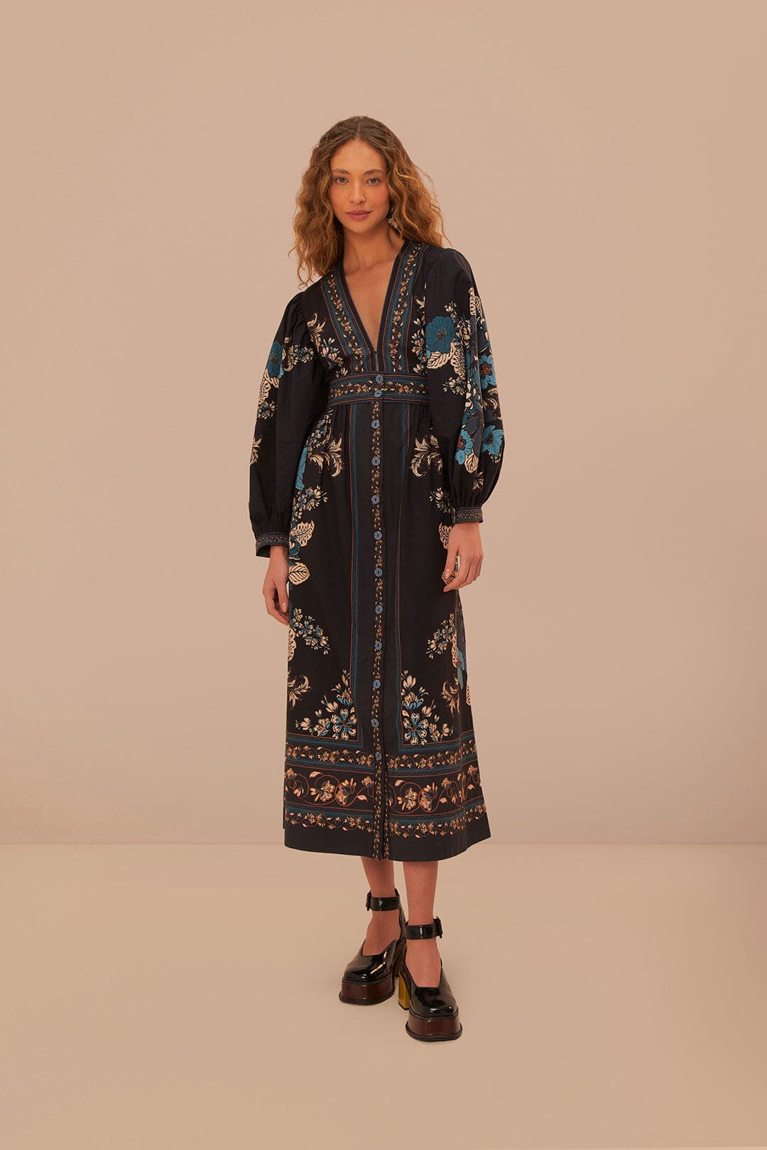 Step into a world of enchantment with the Blossom Tapestry Black Midi Dress, elegantly crafted with a V neckline that leads into an exquisite tapestry of florals in vibrant hues. The relaxed silhouette, accented with a defined waist and gentle flowing skirt, offers a blend of comfort and feminine charm. Puff sleeves add a soft, romantic touch, making this dress your perfect companion for any occasion that calls for a whisper of whimsy and a touch of grace.
