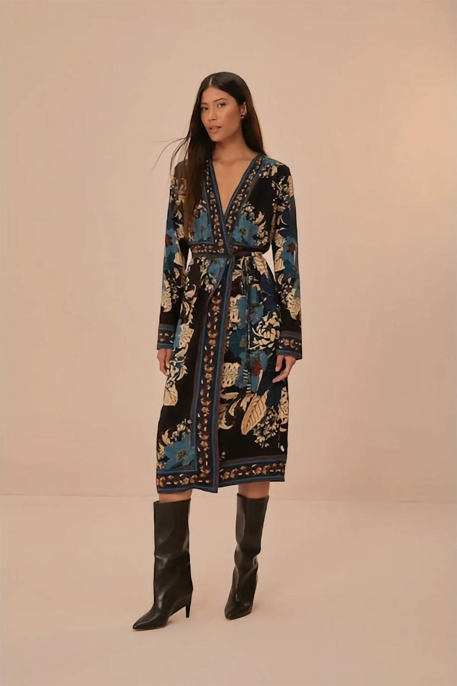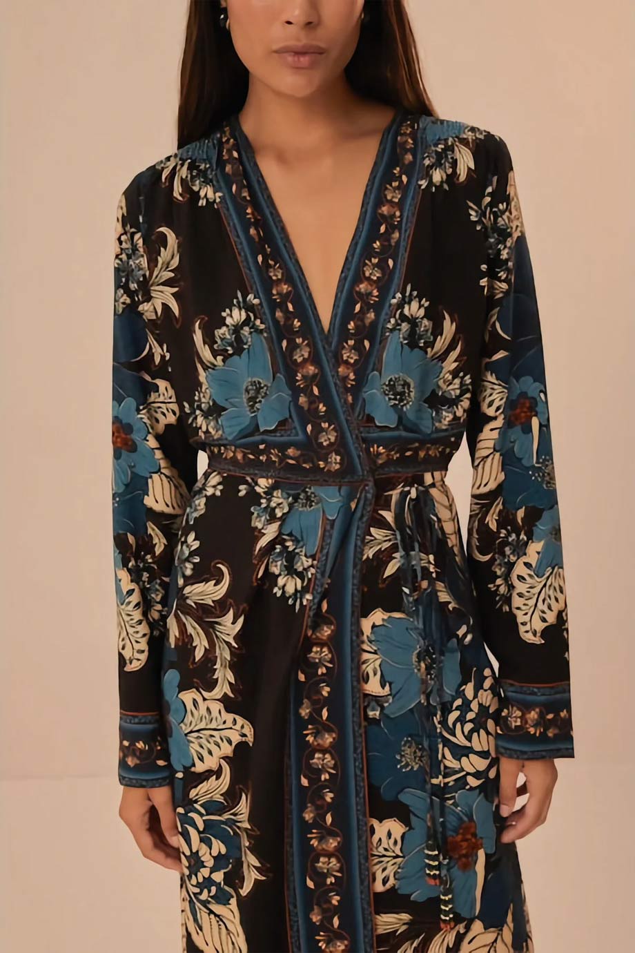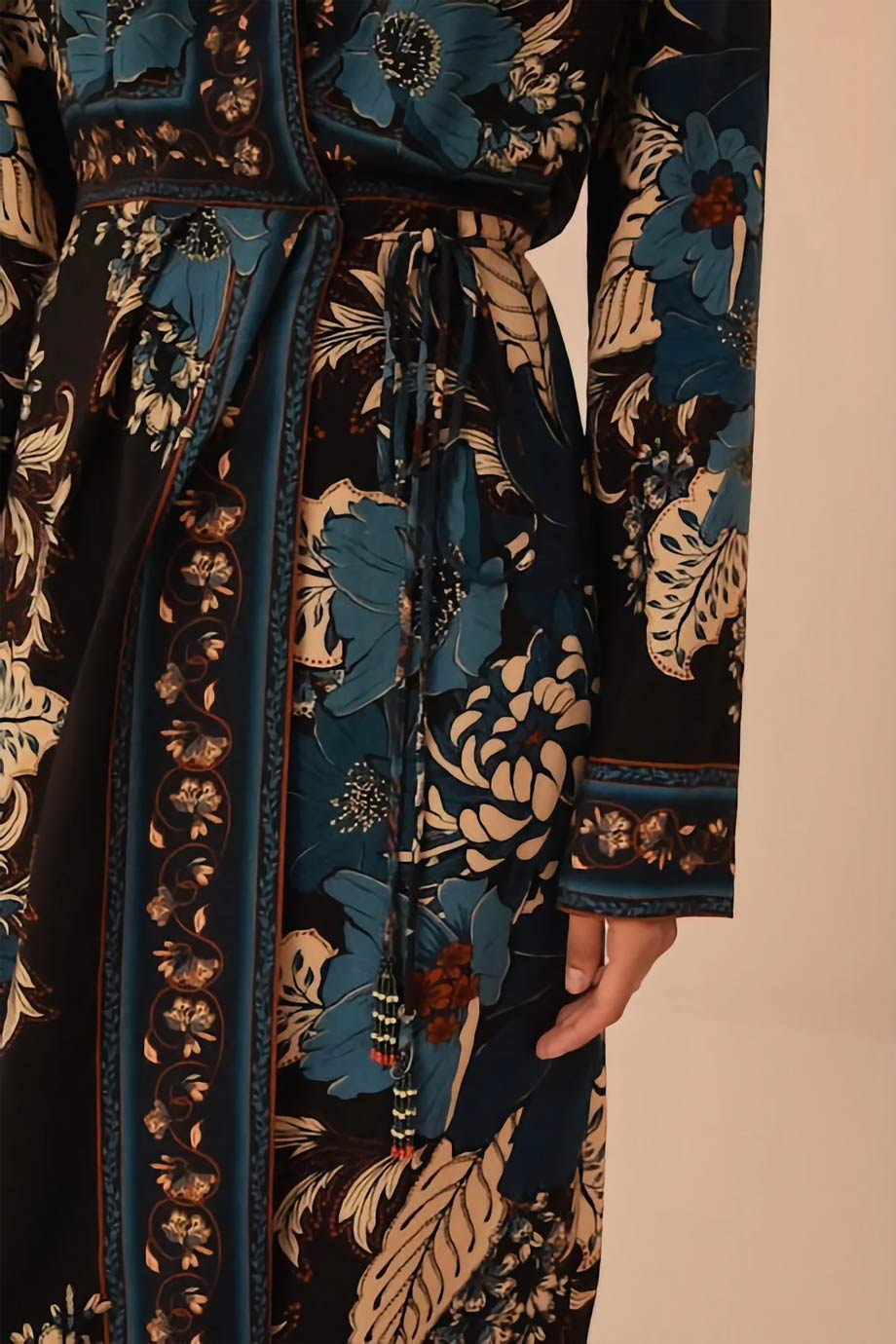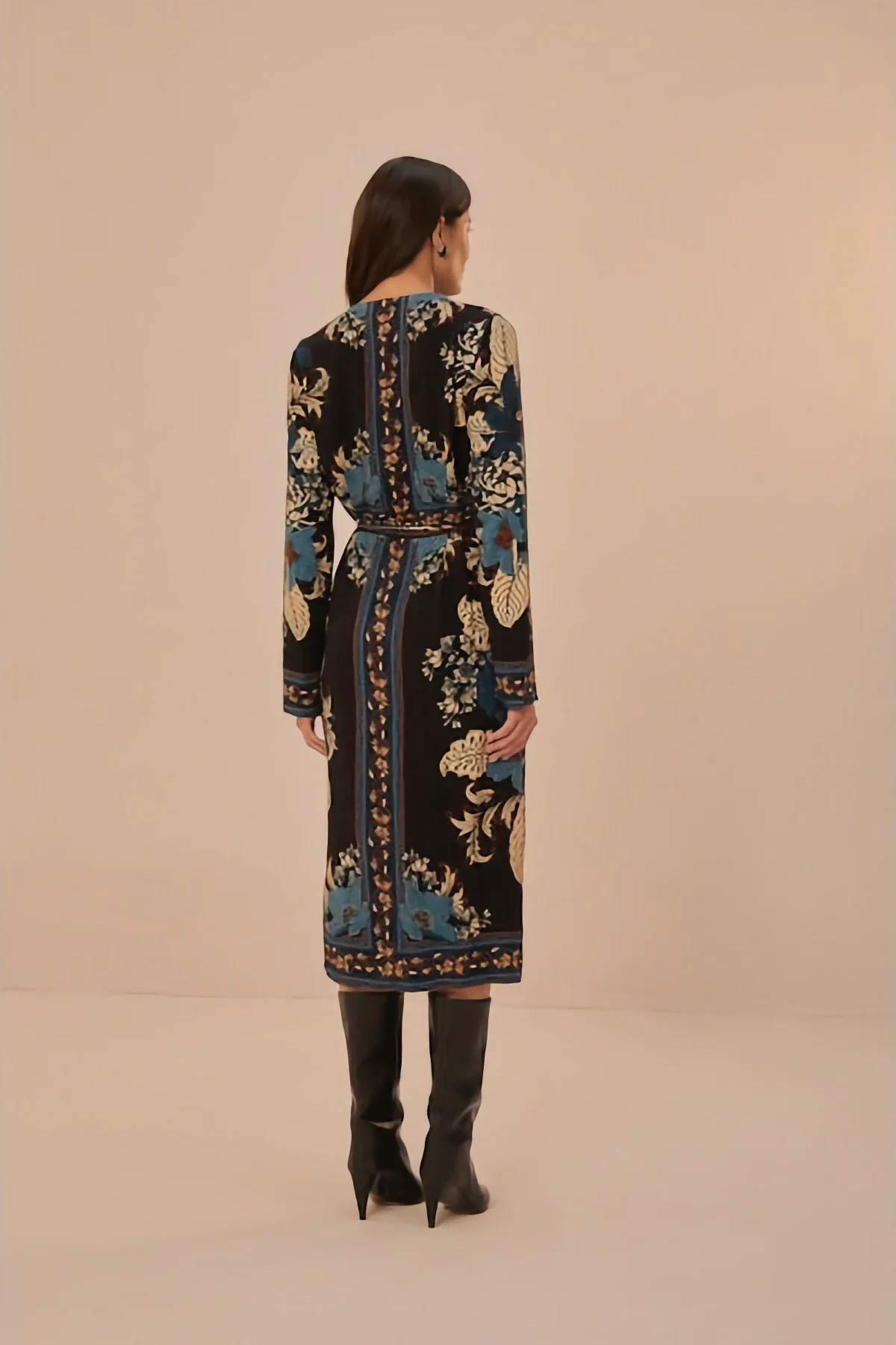 Be a vision of elegance in this tapestry-inspired wrap dress that has stylish smocking along the shoulders.