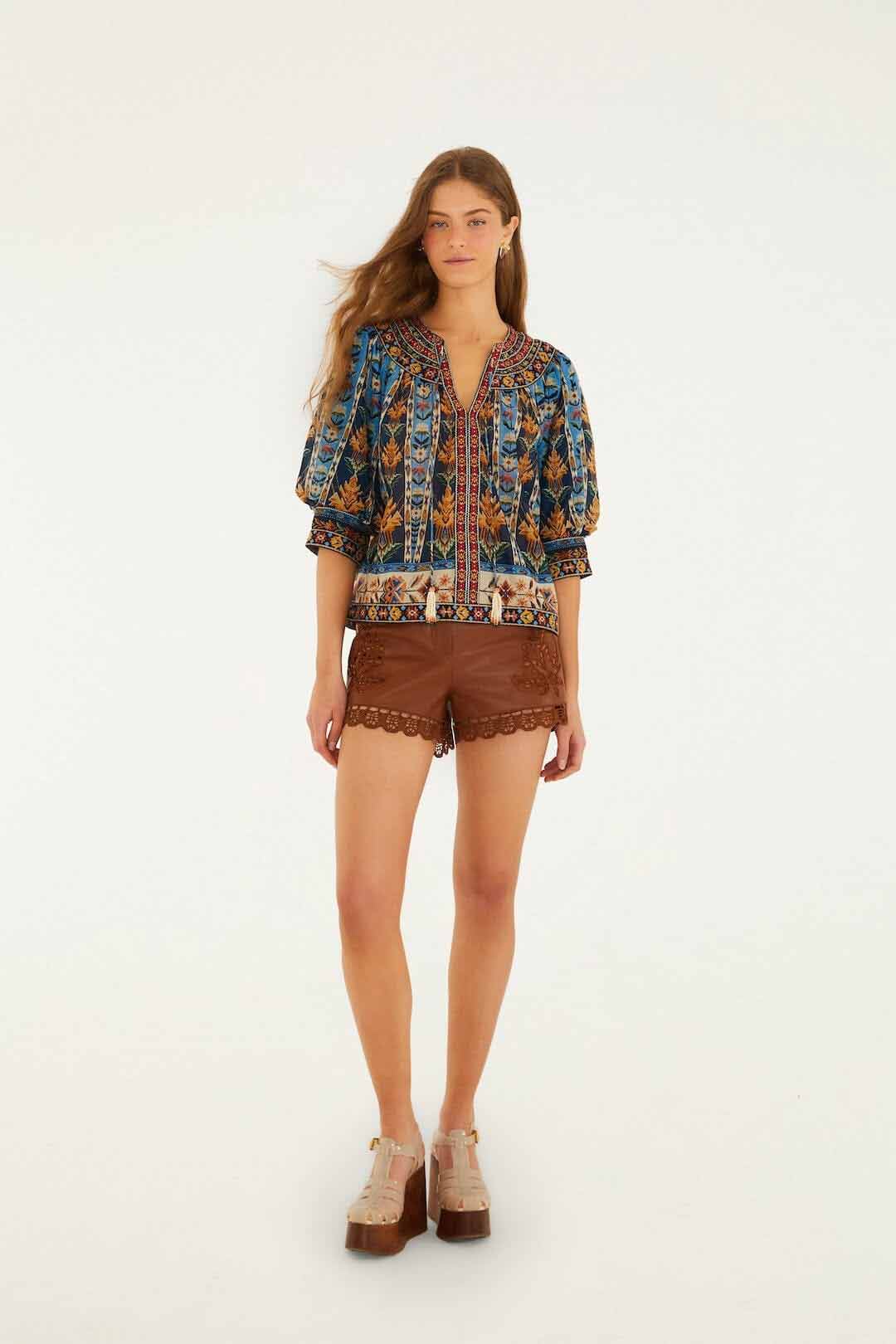 FARM RIO EMBROIDERED TAPESTRY TASSELS BLOUSE BLUE