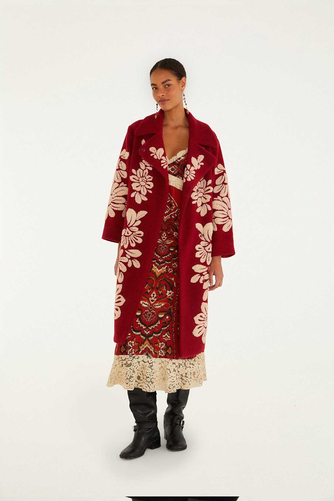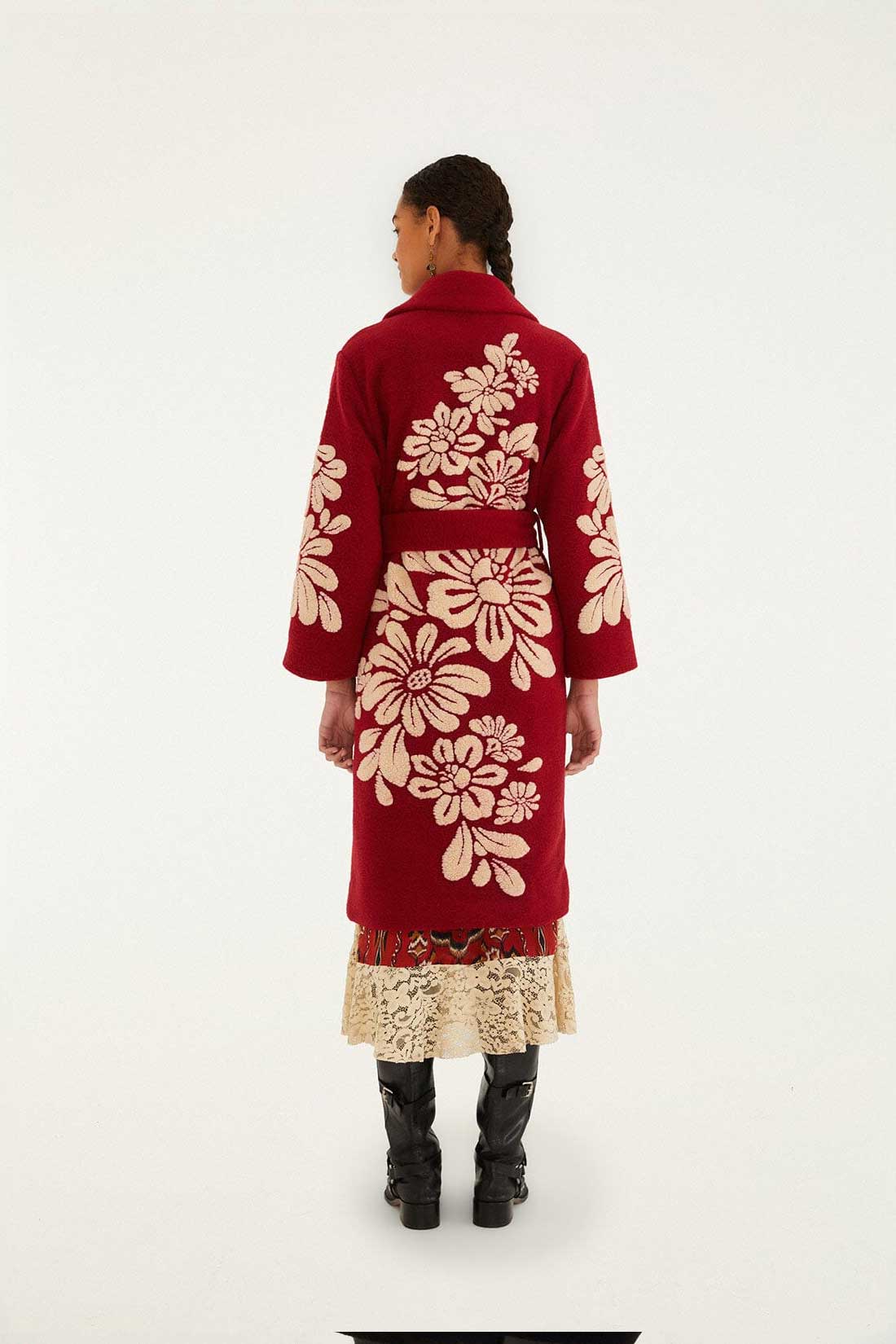 Wrap yourself in the cozy charm of the Burgundy Bold Flowers Fleece. This standout outerwear piece features a rich burgundy base adorned with large, playful cream floral motifs that dance across the fabric. Its relaxed silhouette and soft collar neckline invite warmth and ease, while the matching tie belt cinches the waist, adding a flattering shape. Perfect for bringing a touch of vibrant comfort to any day.
