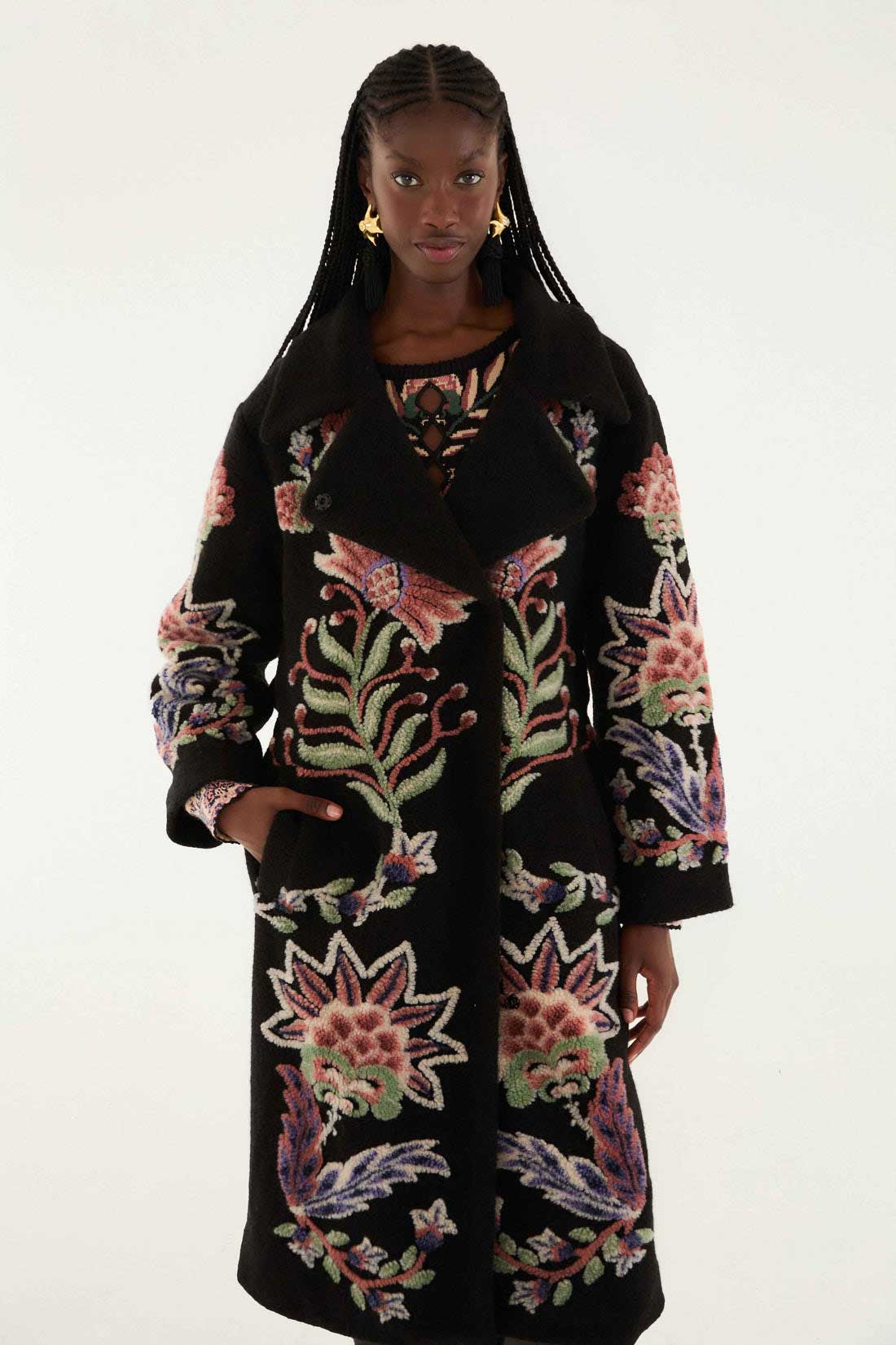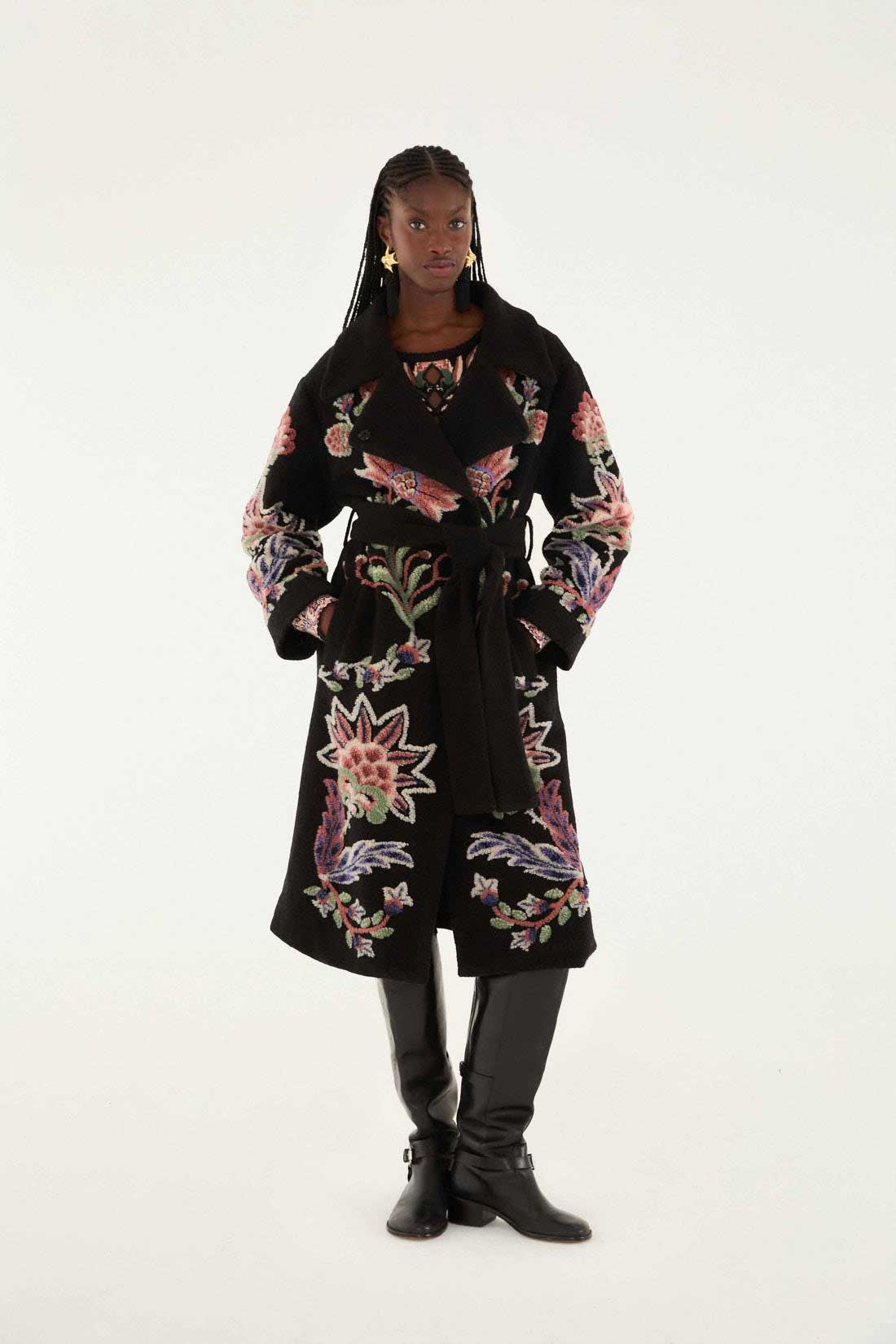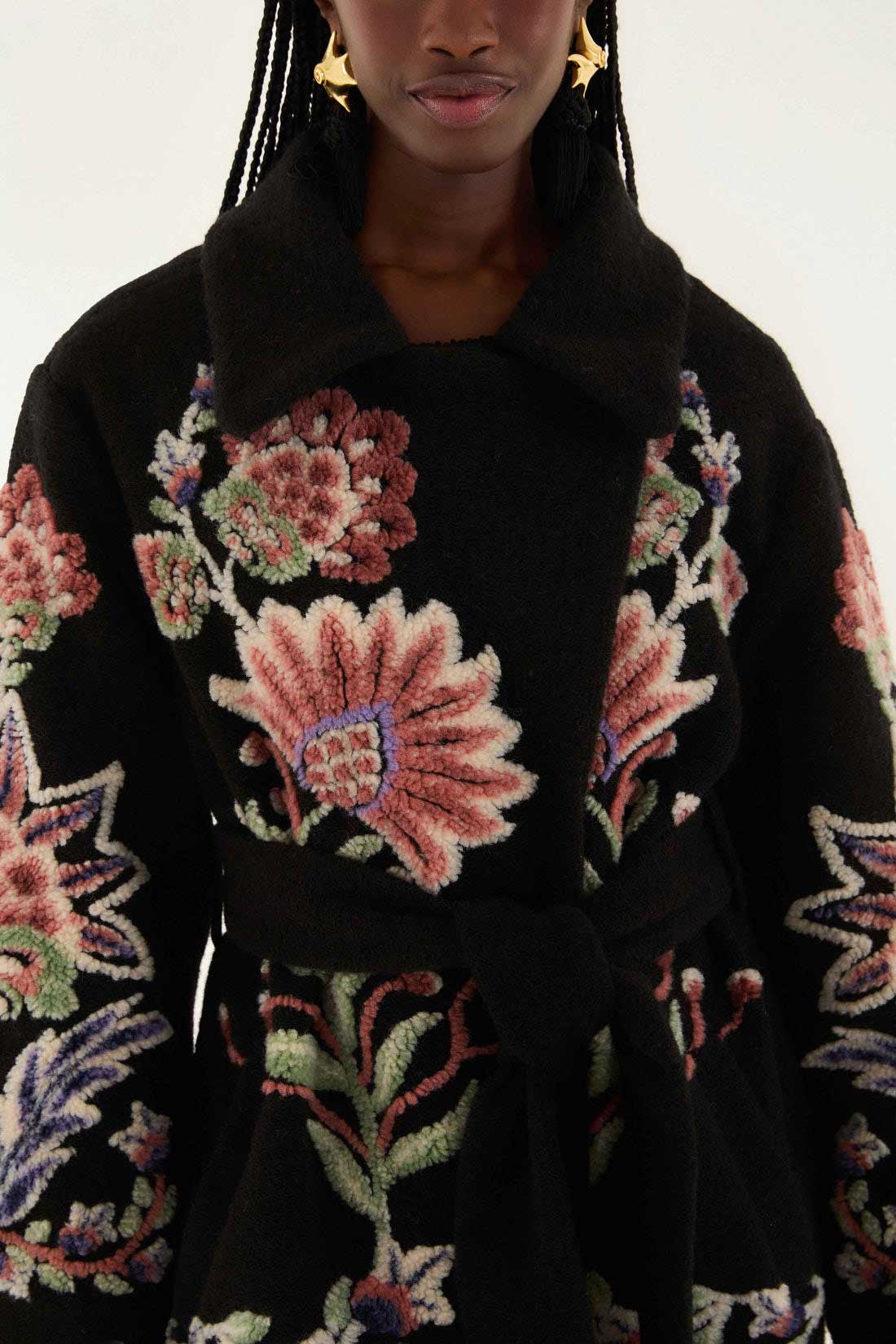 Wrap yourself in the Marvelous Garden Fleece Coat, where bold floral embroidery blooms against a deep black backdrop. This outerwear features a structured collar neckline and a belted waist that sculpts a graceful silhouette. Soft fleece fabric adds warmth, while the vibrant botanical patterns on sleeves and hem evoke a playful garden charm. It’s a statement piece blending cozy comfort with expressive artistry to brighten any chilly day.