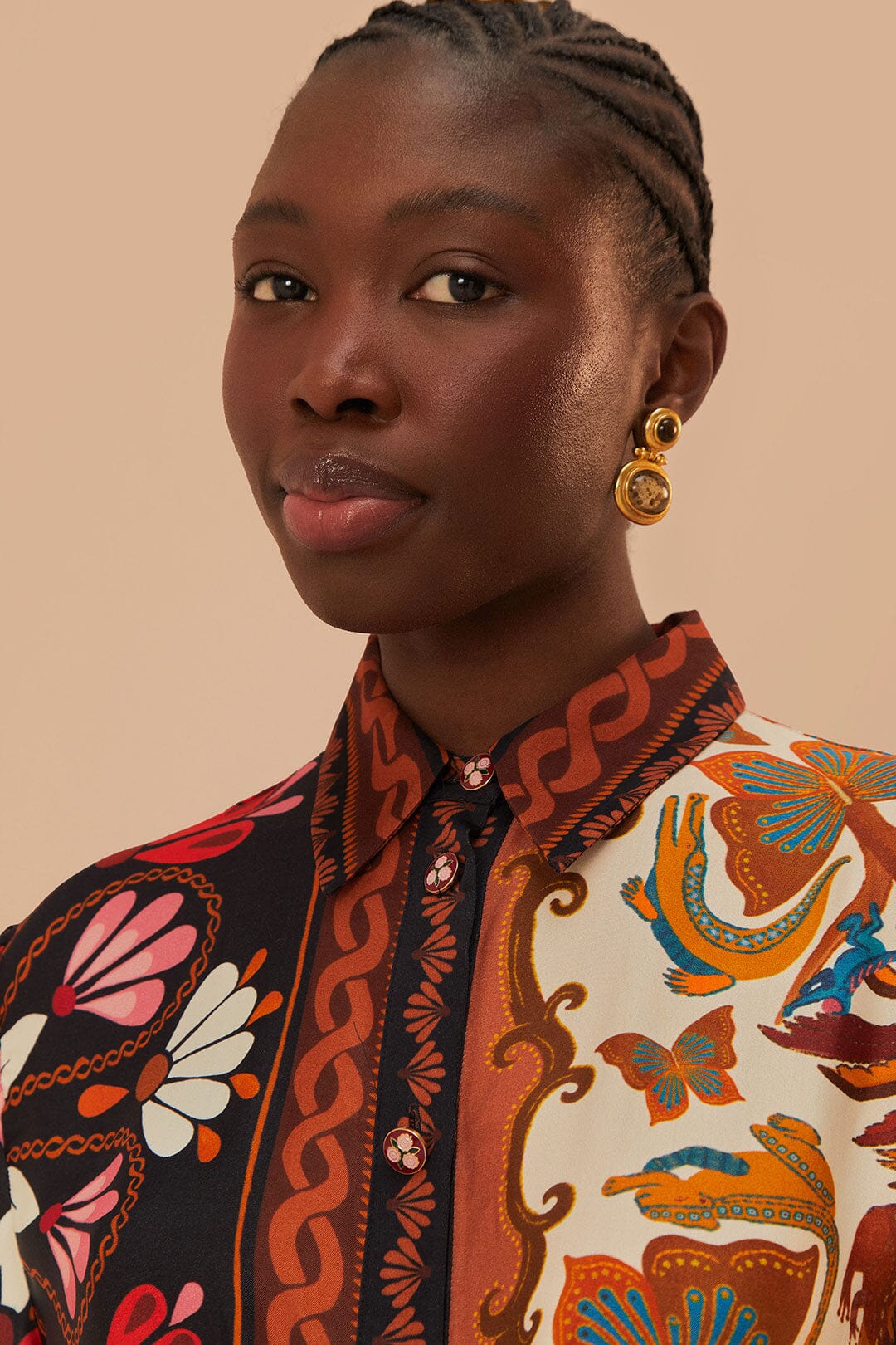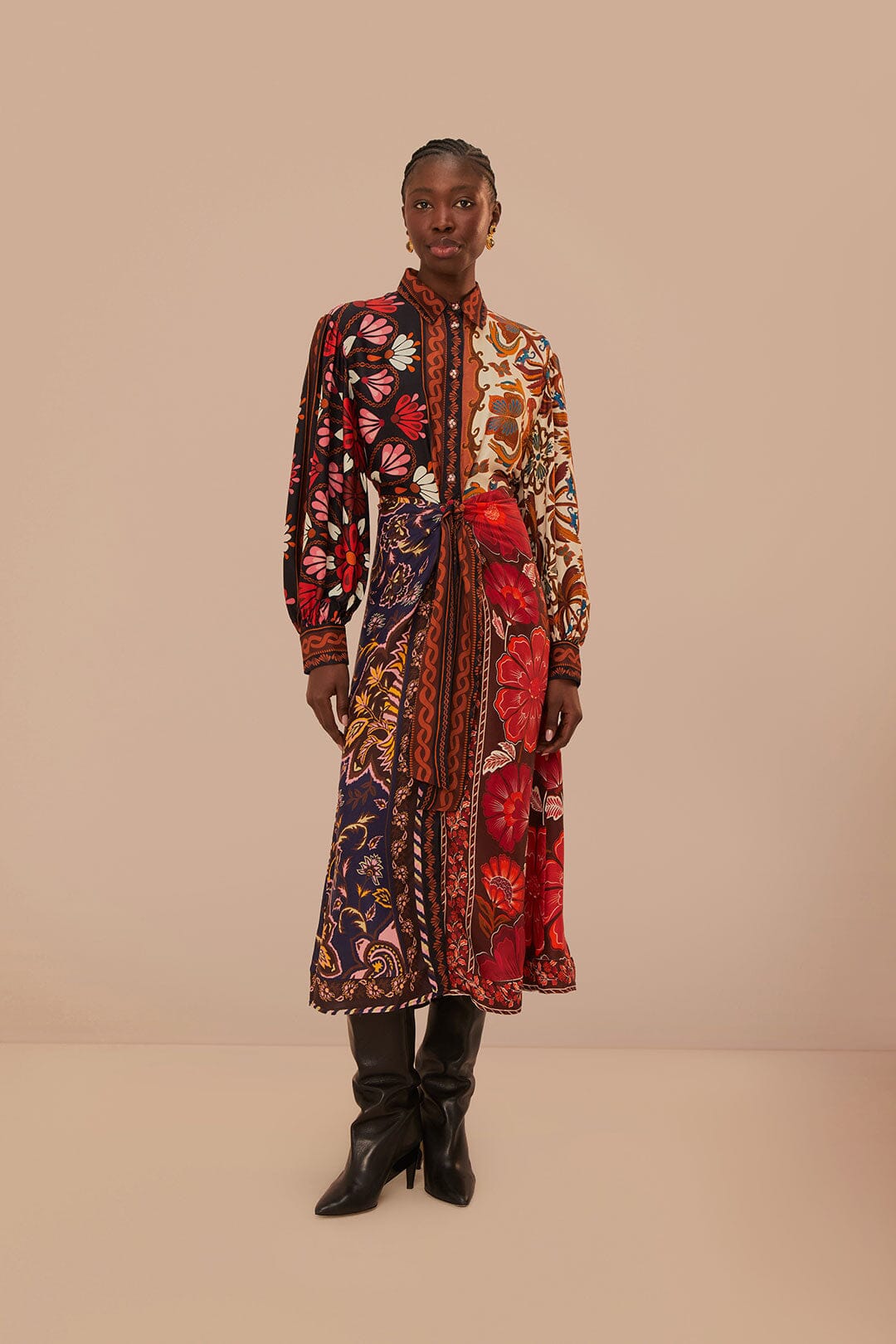 Wrap yourself in the lush tapestry of the Multicolor Miranda Mix LENZING™ ECOVERO™ Viscose Chemise Midi Dress, where vibrant florals meet intricate geometric details in a captivating dance of color. This artful piece boasts a mix of patterns, enriched by a collar neckline, setting the stage for a truly unique silhouette. Crafted with care from LENZING™ ECOVERO™ Viscose, you’ll cherish the feel as much as the knowledge that your fashion choice treads lightly on the earth. LENZING™ ECOVERO™: the eco-responsible fibers generate up to 50% lower emissions and water impact compared to generic viscose.