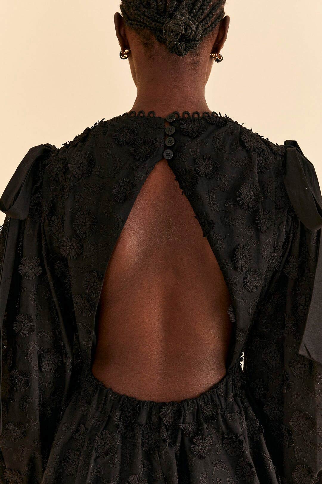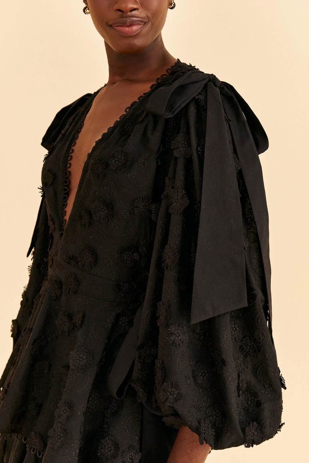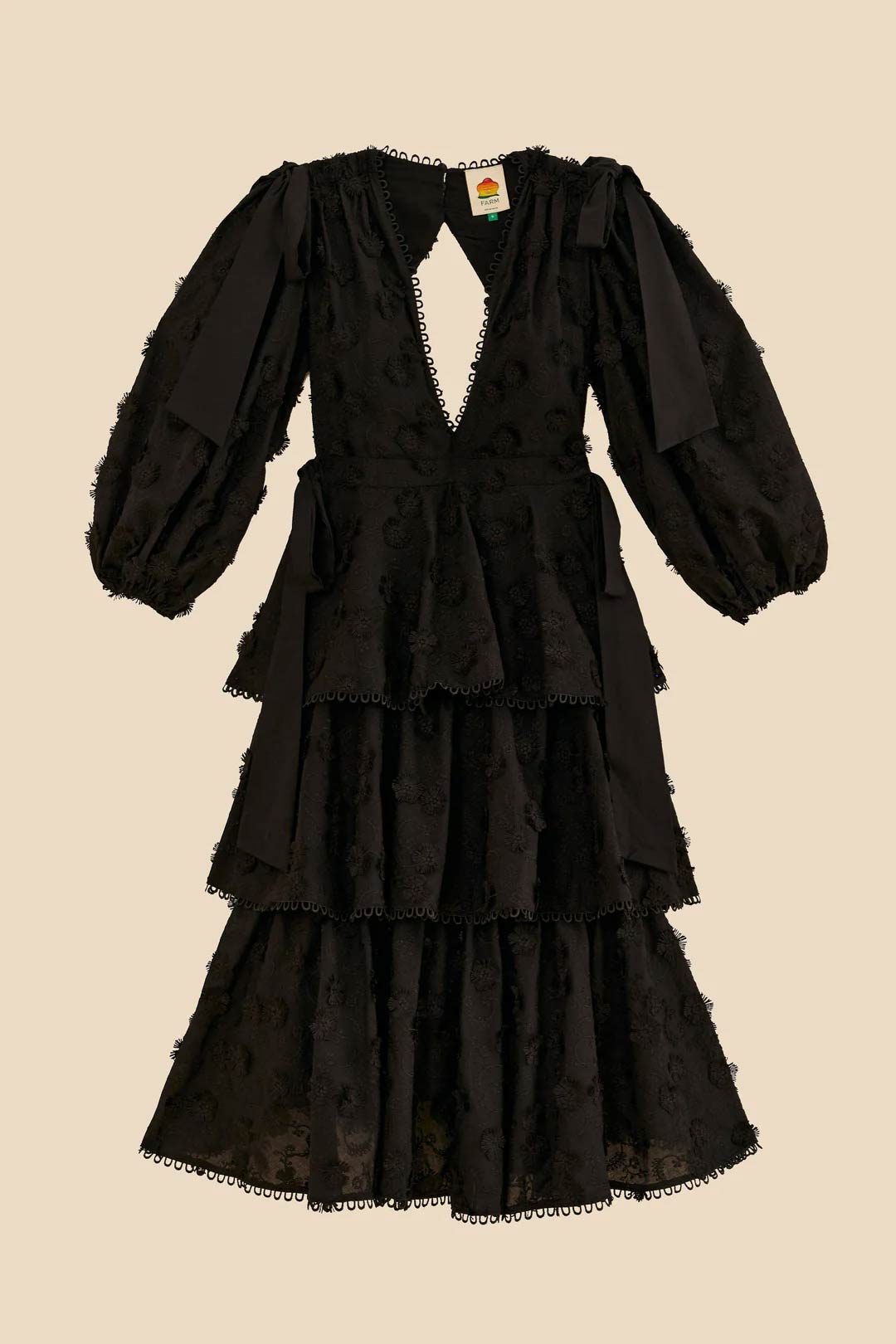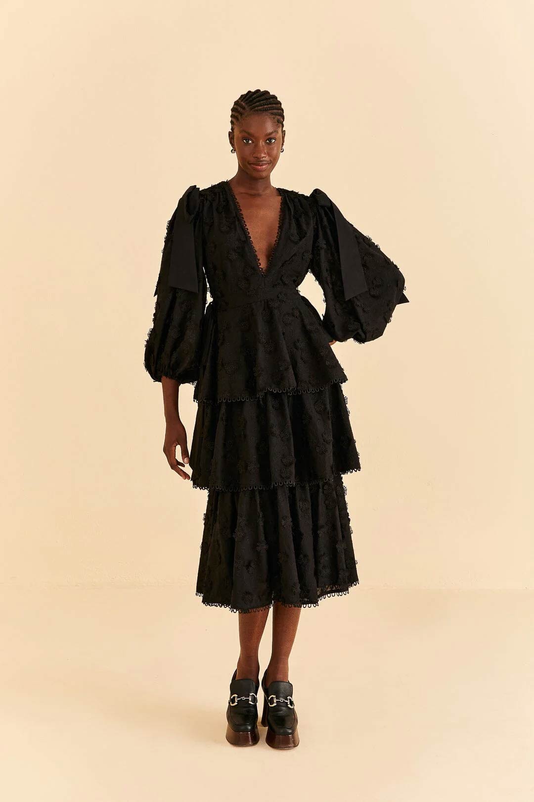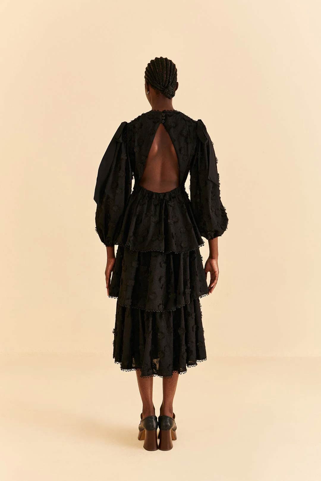 FARM TIO BLACK FLOWERS TIERED MIDI DRESS