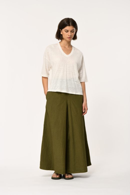 Loose-fitting tee-shirt in flamed linen, V-neck, elbow-length sleeves, dropped armholes.