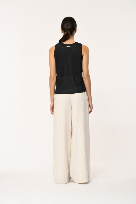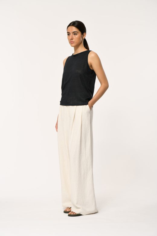Loose tank top in slub linen, round neckline, straight cut.