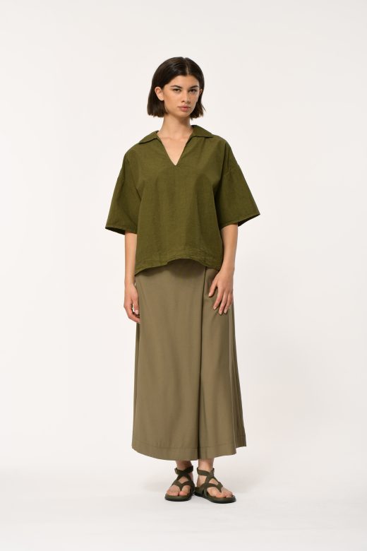 Loose top in crinkled cotton, polo collar, wide elbow-length sleeves, dropped armholes.