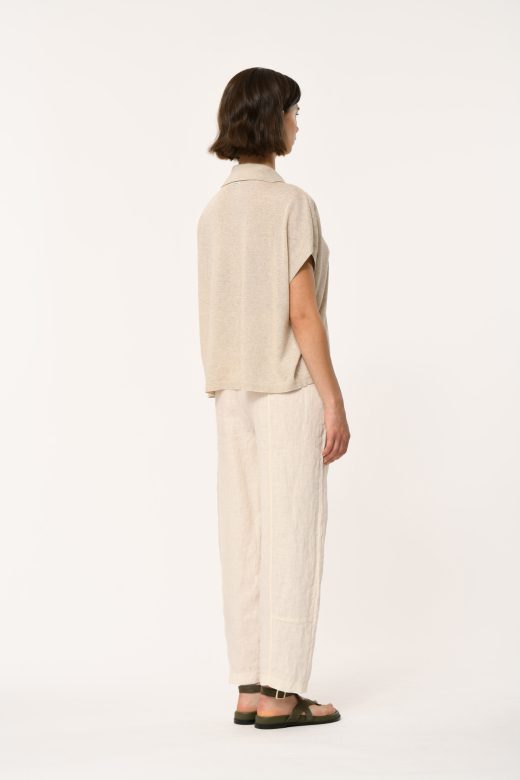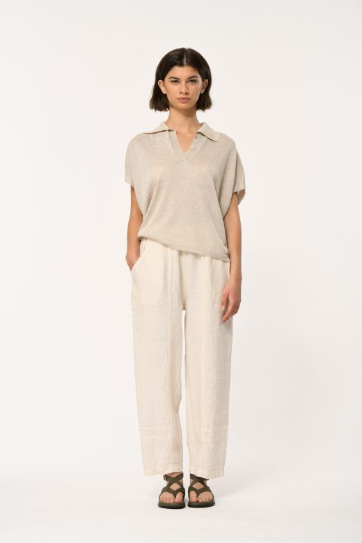 7/8 length linen pants, panel detailing, elasticated waistband, side pockets inserted into the panels.