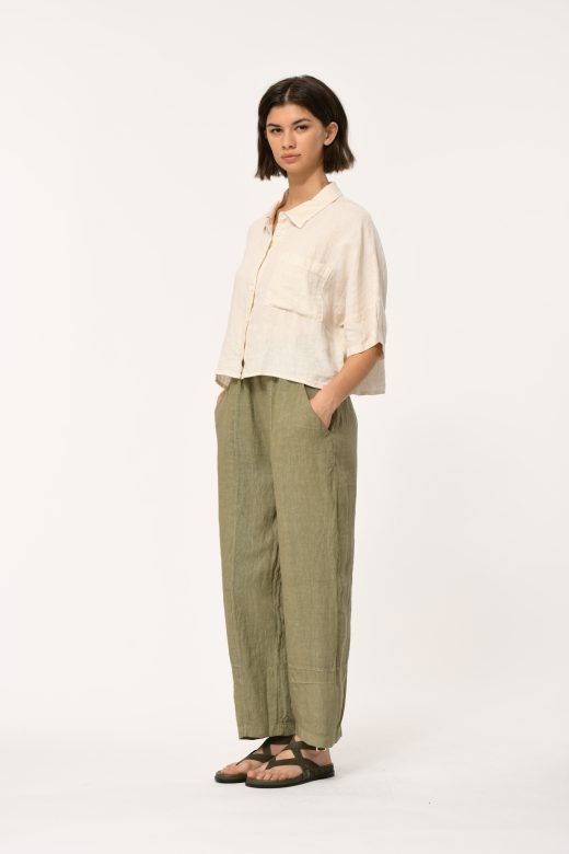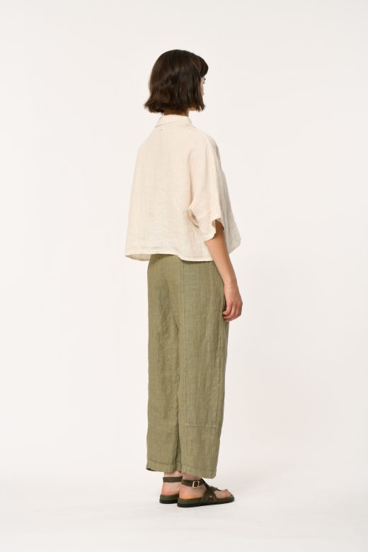 7/8 length linen pants, panel detailing, elasticated waistband, side pockets inserted into the panels.