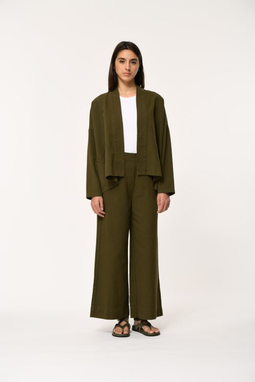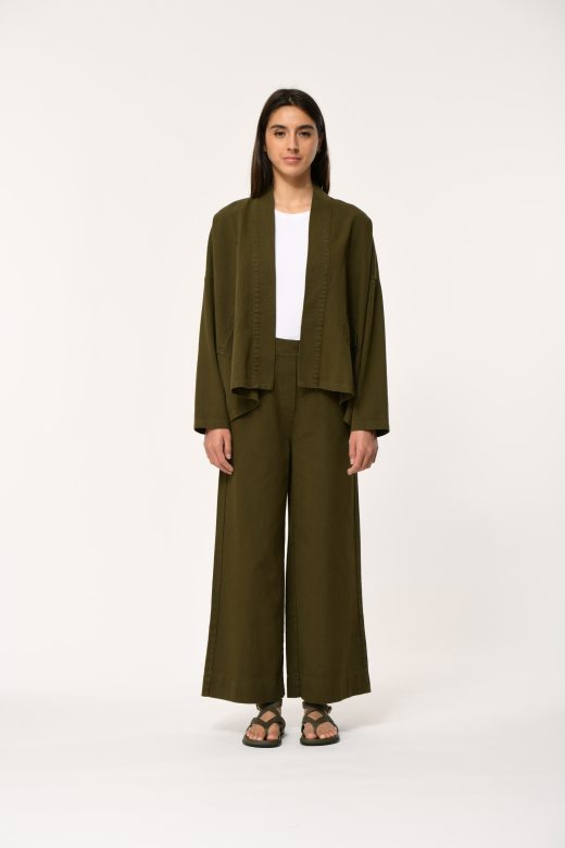 Oversized kimono jacket in cotton drill, collarless, long sleeves with dropped armholes, slanted patch pockets at the front.