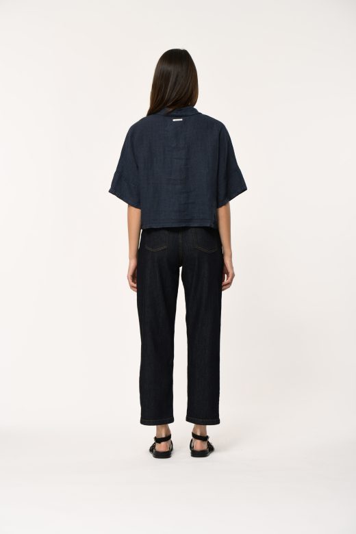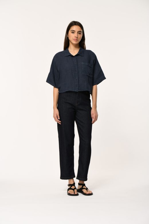 Boxy shirt in plain linen, box shape and relaxed fit, elbow-length sleeves with wide cuffs.