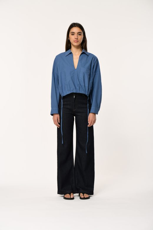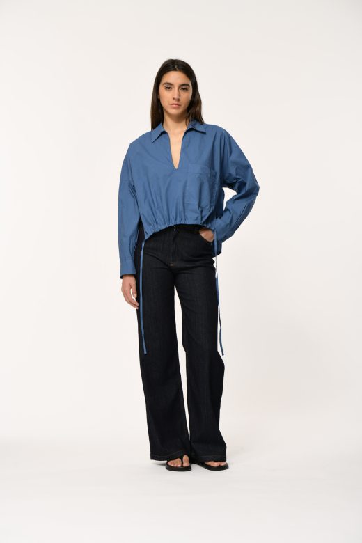 Crop shirt in cotton poplin, polo collar, loose straight cut, long sleeves with buttoned cuffs, adjustable waist with drawstring and tie, side slits, longer at the back.