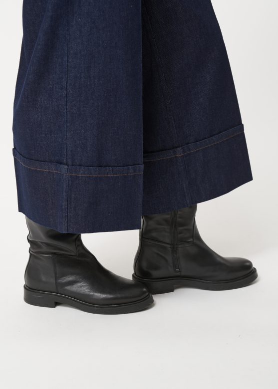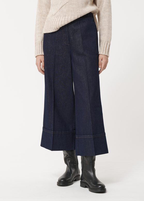 Wide-leg pants in raw denim, 7/8th length, elasticated back waistband, false fly and elasticated back waistband, Italian pockets.