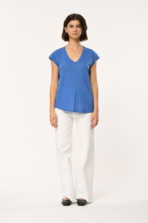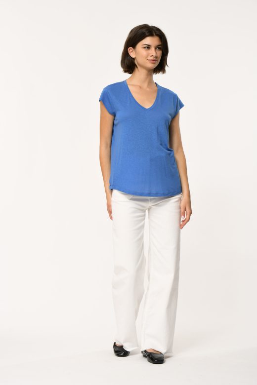 Straight cut t-shirt, V-neck, short, drooping sleeves.