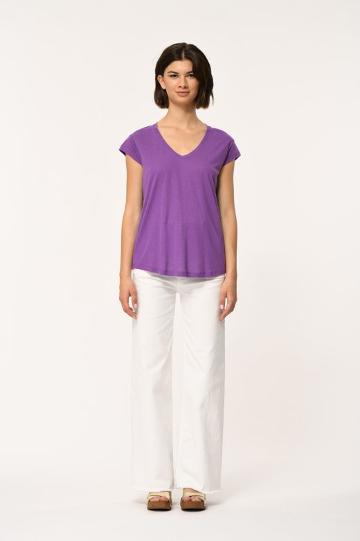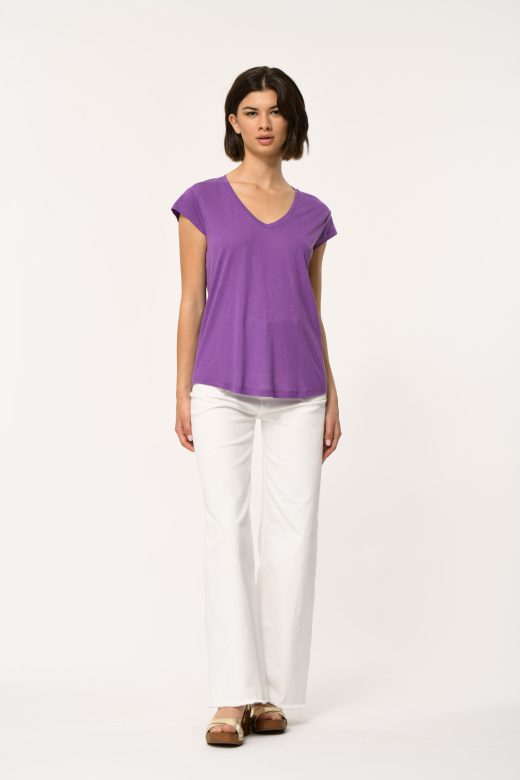 Straight cut t-shirt, V-neck, short, drooping sleeves.