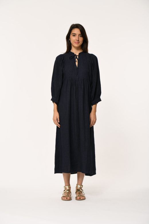 LONG LINEN DRESS, TUNISIAN NECKLINE WITH TIES, LONG PUFFED SLEEVES WITH BUTTONED CUFFS, CUT UNDER THE BUST WITH GATHERING.