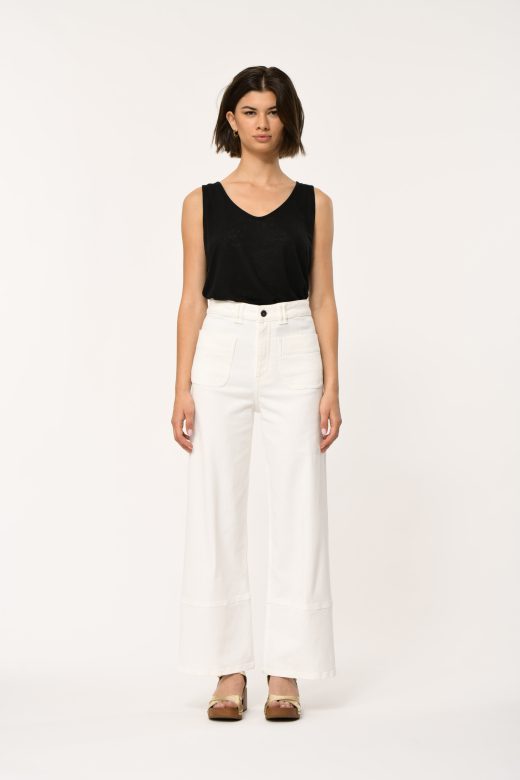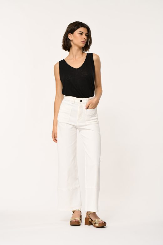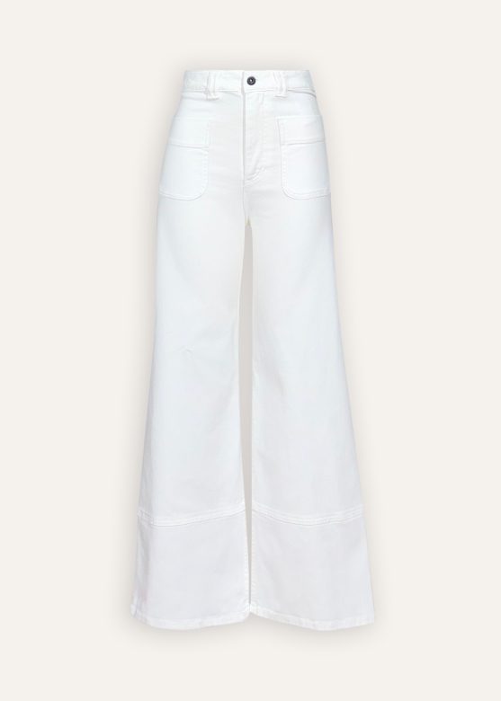 Straight leg jeans, 7/8 length with high waist, patch pockets front and back, metal buttons and zip fixing, and wide leg hem.