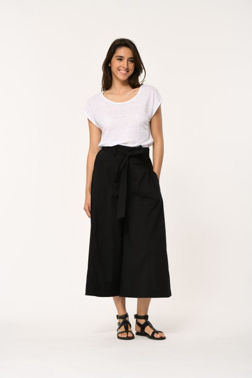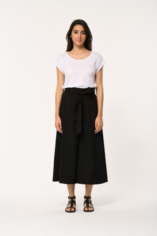 7/8 PANTS, EXTRA WIDE LEGS, ELASTIC BACK, ITALIAN POCKETS, CUTOUTS ON THE FRONT AND BACK MID-LEG, REMOVABLE TIE BELT.