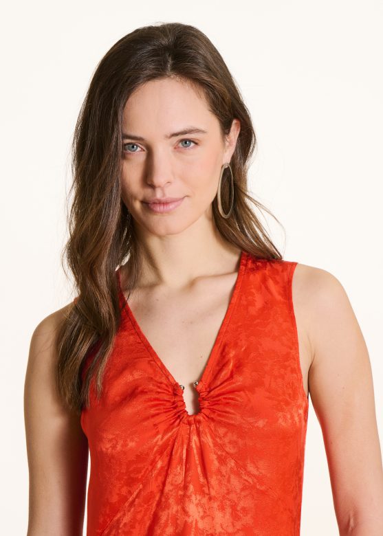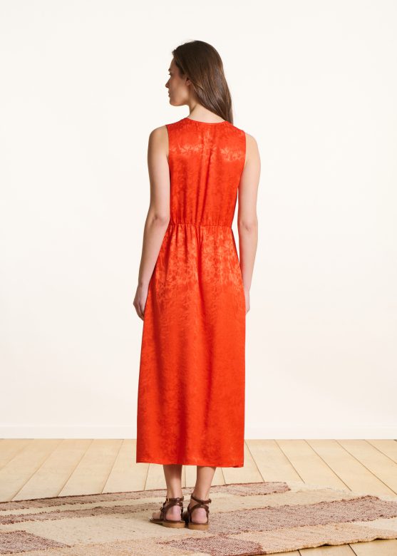 Long dress with jacquard patterns, dropped sleeves, v-neck with fancy metal buckle with cutout under the bust.