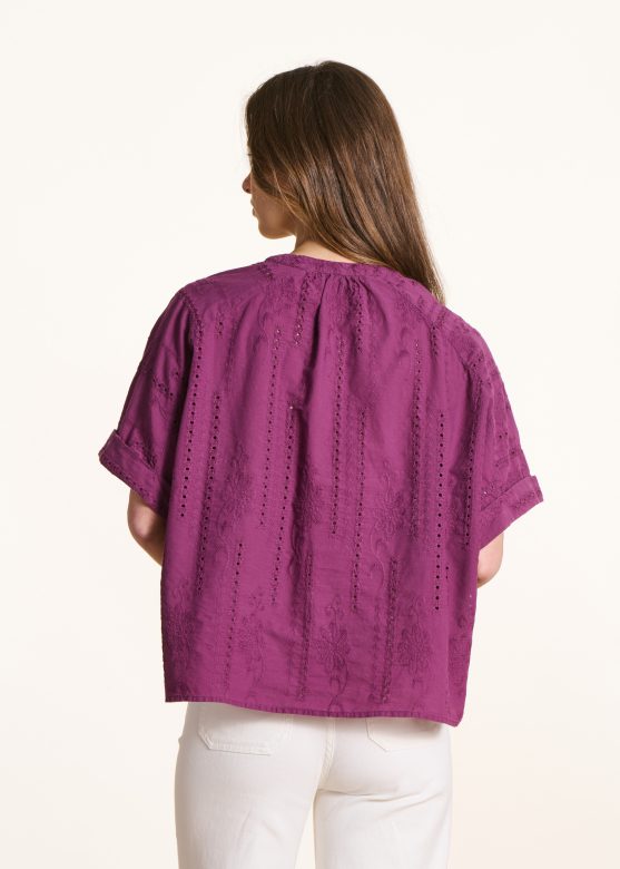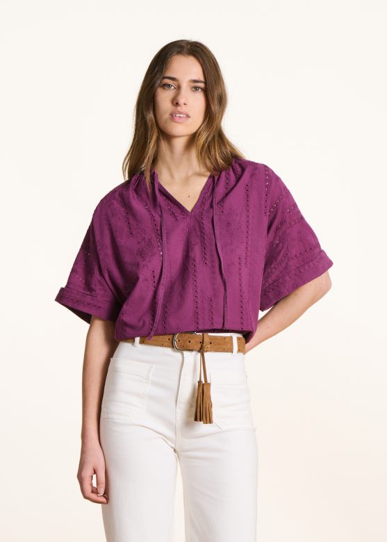 Loose blouse in engligh embroidery with Tunisian collar and elbow-sleeves.
