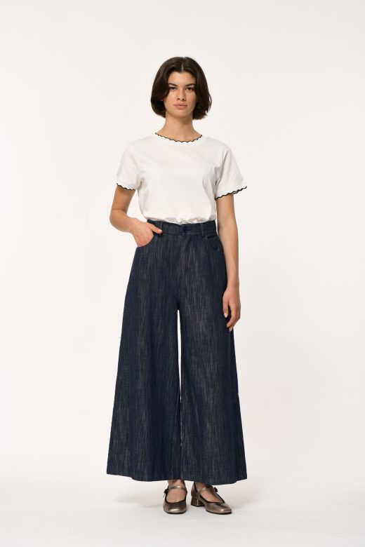 7/8 denim trousers with very wide legs, front side pockets and back patch pockets.