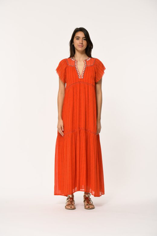 Graphic printed ruffle dress, lined, tunisian collar with embroidery finish, short ruffled sleeves, embroidered necklin panel with trim at the waist and above the ruffle.