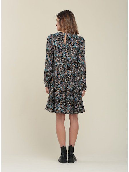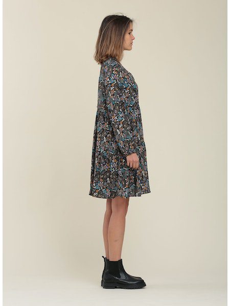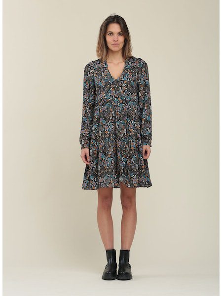 TIERED SHORT DRESS, V-NECK, LONG SLEEVES.