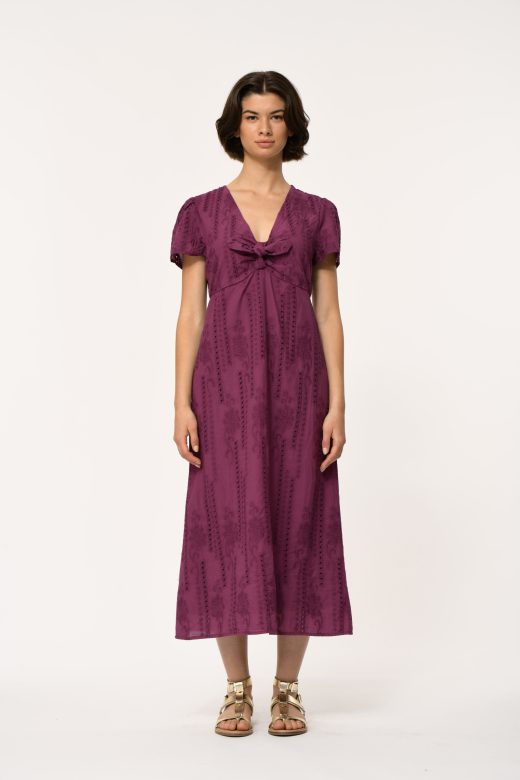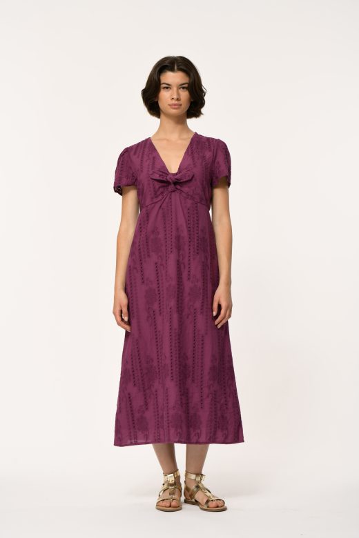 Mid-length dress in cotton english embroidery, short sleeves, with v-neck bow.