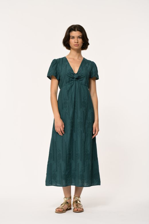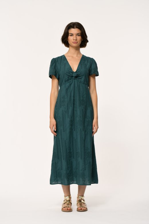Mid-length dress in cotton english embroidery, short sleeves, with v-neck bow.