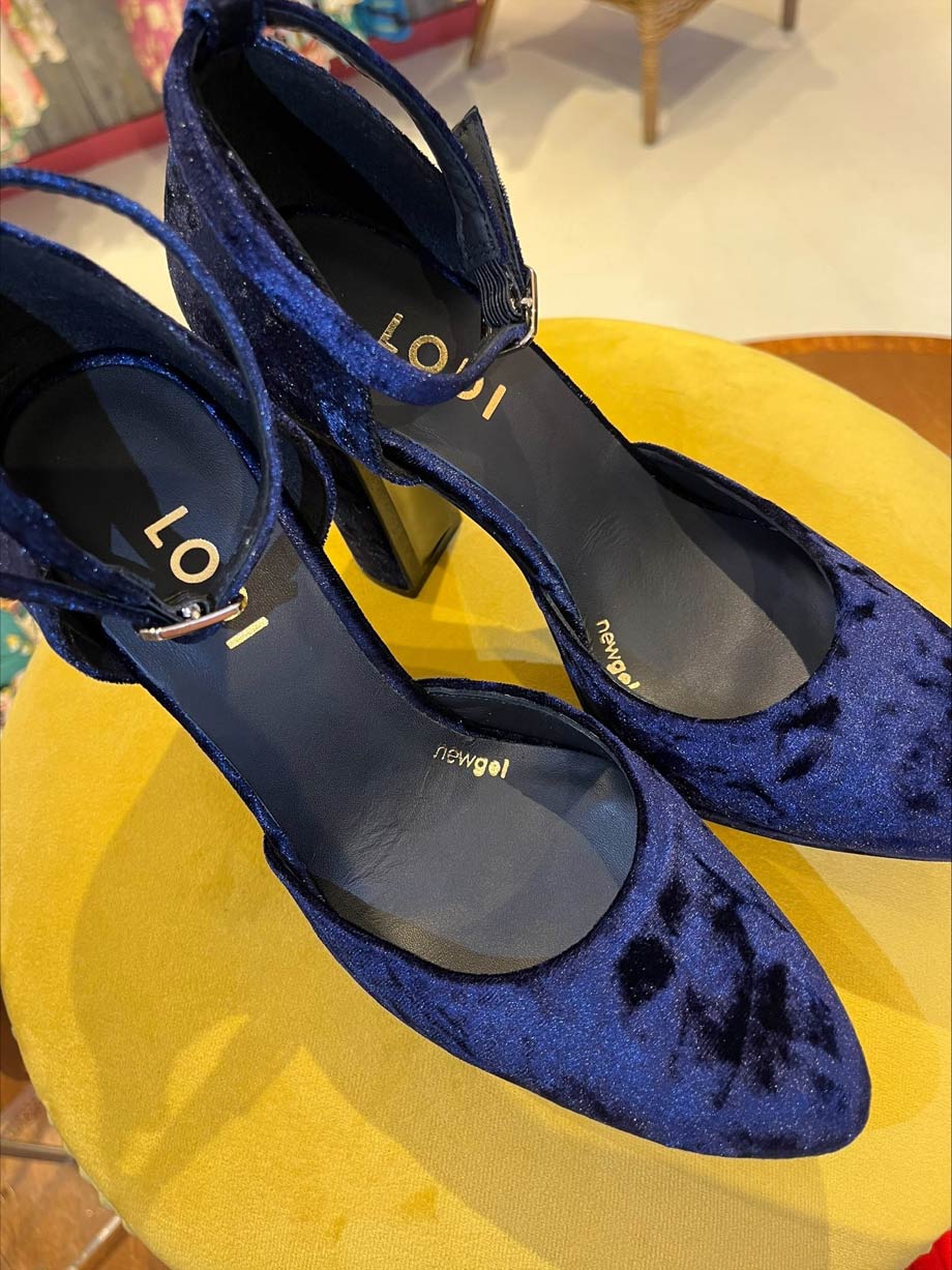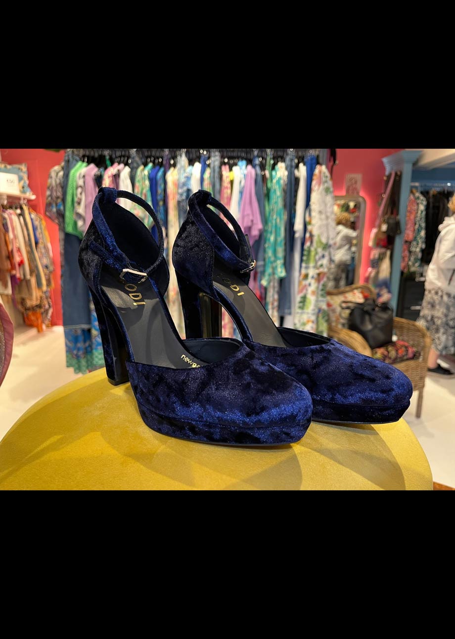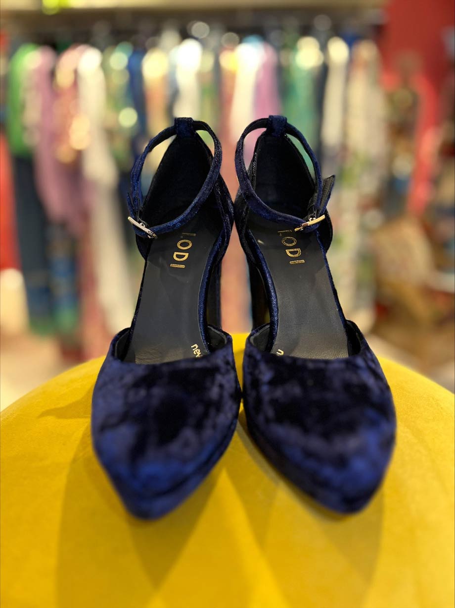 TIZIS by LODI women´s platform pumps in blue velvet. Featuring an 11 cm heel and 2.5 cm platform. Buckle closure with ankle strap. Leather-lined interior. Includes a new gel sole for comfort in every step. Made in Spain.
