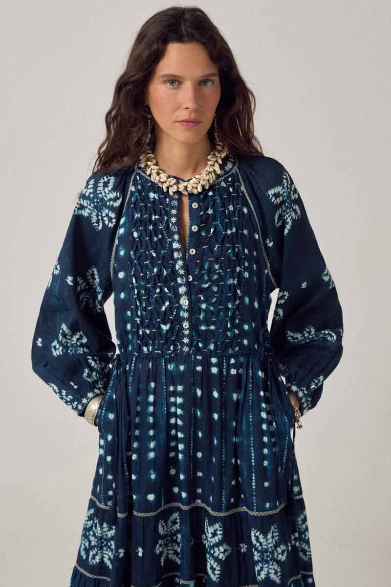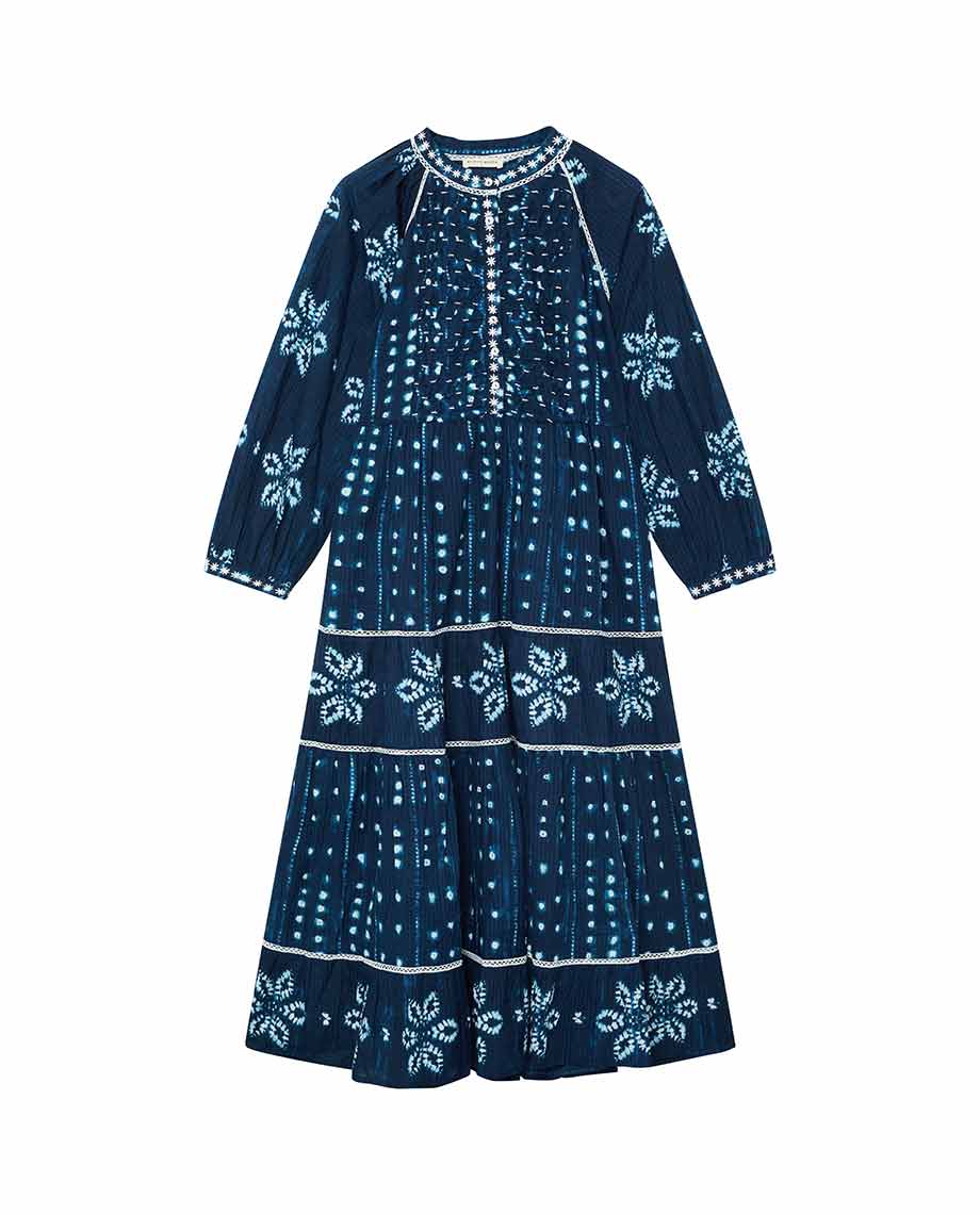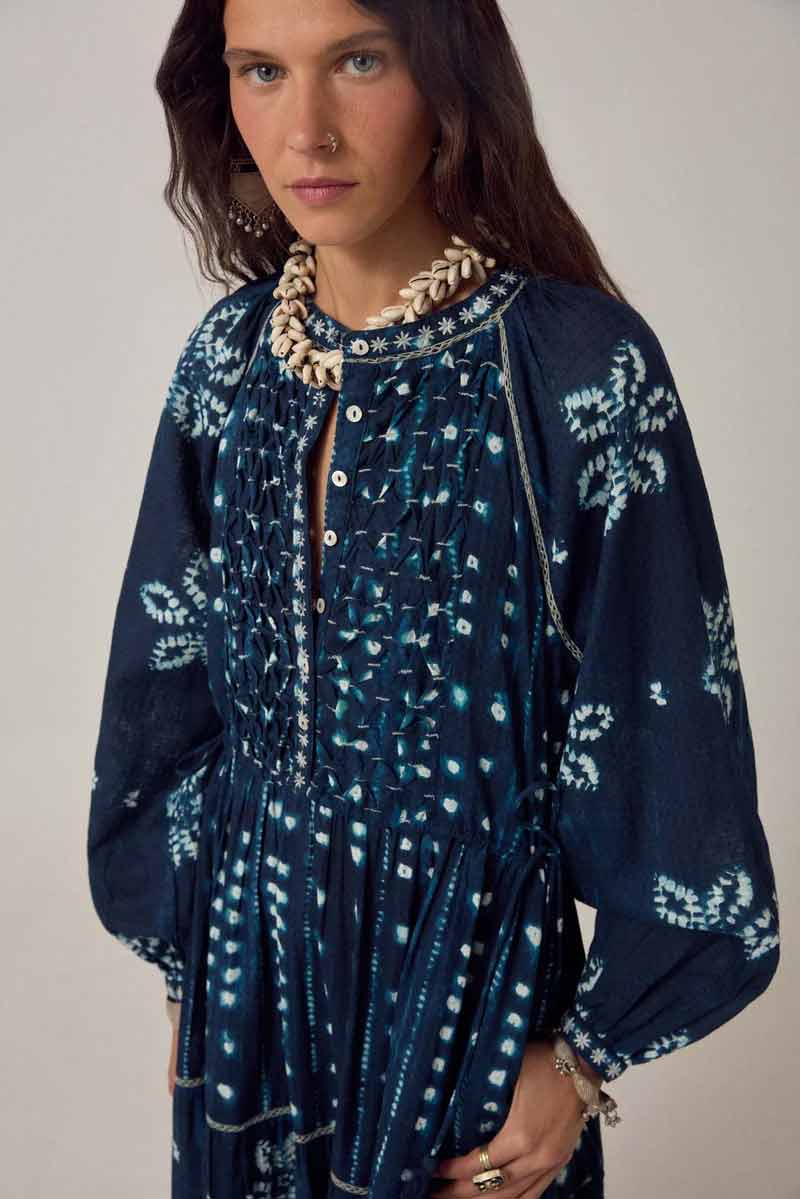 Shibori-inspired print in midnight navy and sky blue, inspired by traditional Japanese dyeing. Cut in 100% cotton with smocking across the chest and long sleeves with embroidered cuff details. Buttons down the front to the waist, round neckline with embroidered trim. Lined to the knee so it moves easy but keeps its shape.