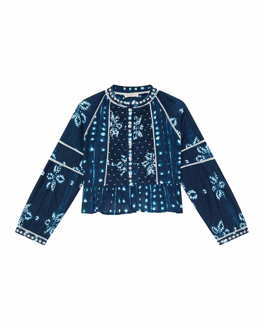 Cropped blouse in shibori-inspired print—midnight navy with sky blue dots and florals. Cut in 100% cotton with smocking at the chest, round neckline trimmed with embroidered flowers. Long sleeves with embroidered cuff details and trim running down the sleeve.