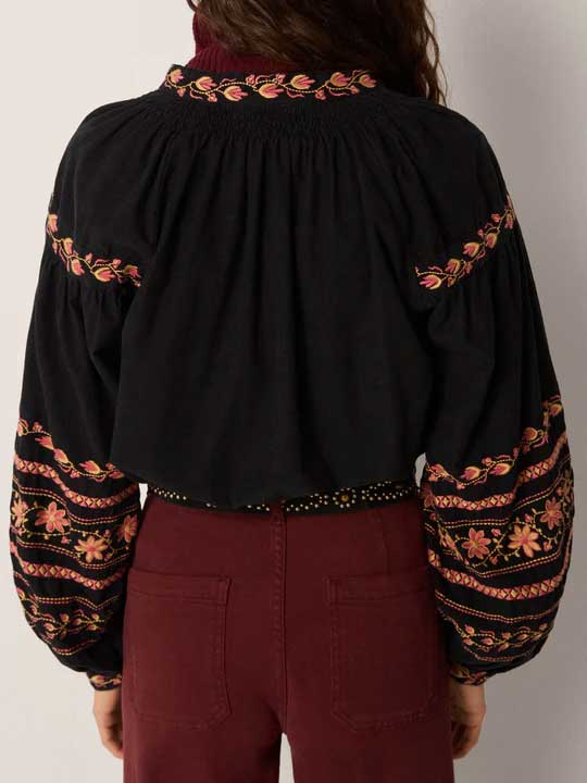 Florals in rose, grape and ochre climb across chest and sleeves, lit against a black ground. The embroidery is dense and intricate, resembling tapestry work both ornate and alive.